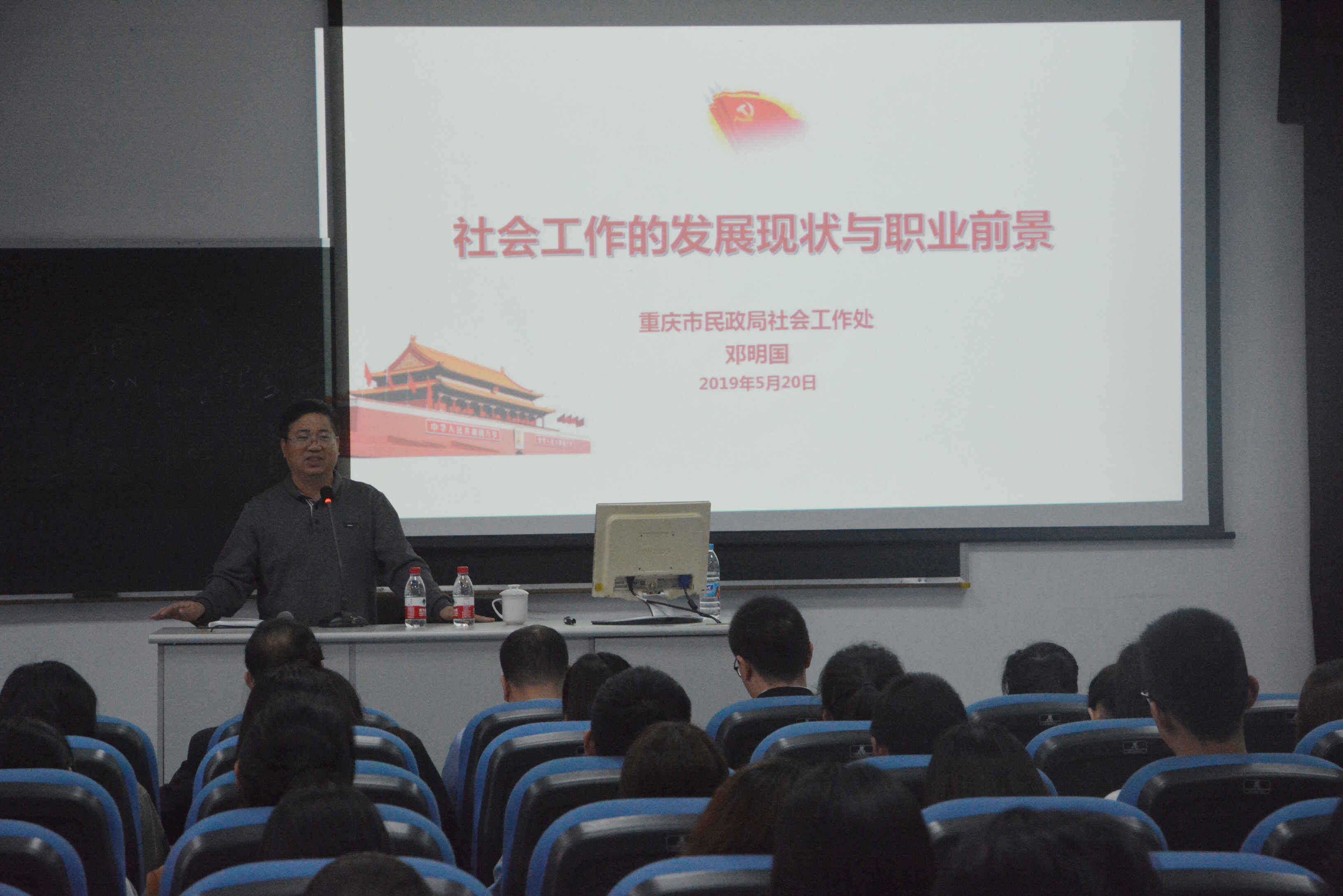 5月20日下午3点,重庆市民政局社工处处长邓明国应邀在文化与社会发展学院做了“社会工作的发展现状与职业前景”专题讲座。本次讲座由学院院长潘孝富教授主持,学院师生积极参与。