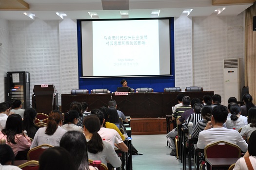 项教授主要从以下三个方面对报告主题进行了阐述。第一,以马克思读书和工作的经历为引,讲述了马克思从唯心主义到唯物主义的转变;第二,以19世纪欧洲的政治经济局势为主线,论述了该时期欧洲社会的发展对马克思个人思想和理论发展产生的深刻影响;第三,以马克思思想在当今德国的发展态势为背景,阐明了马克思主义对欧洲国家特别是德国社会产生的深远影响。项佳谷教授的独到讲解,让我们全面了解了马克思时代欧洲社会的发展状况,深刻地把握了马克思主义产生的实现基础,为我们在专业学习上提供了一种新的逻辑思维。