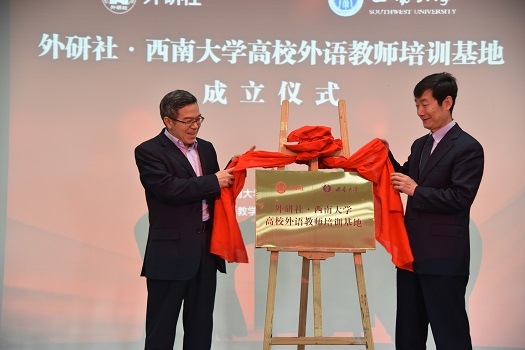 外研社总编辑徐建中和PA视讯外国学院党委书记、博士生导师文旭教授为外研社·PA视讯高校外语教师培训基地揭牌。文旭教授作为东道主致欢迎辞:“本次高校外语教师培训基地的成立对西部地区尤其是西南地区的教师培训做出了重大的贡献!”随后,外研社总编辑徐建中发言:“成立仪式是研修班的序曲,教师培训和教学发展进入新时代,这也对教师教学提出了新的要求。”最后,他祝贺本次研修会可以取得圆满成功!