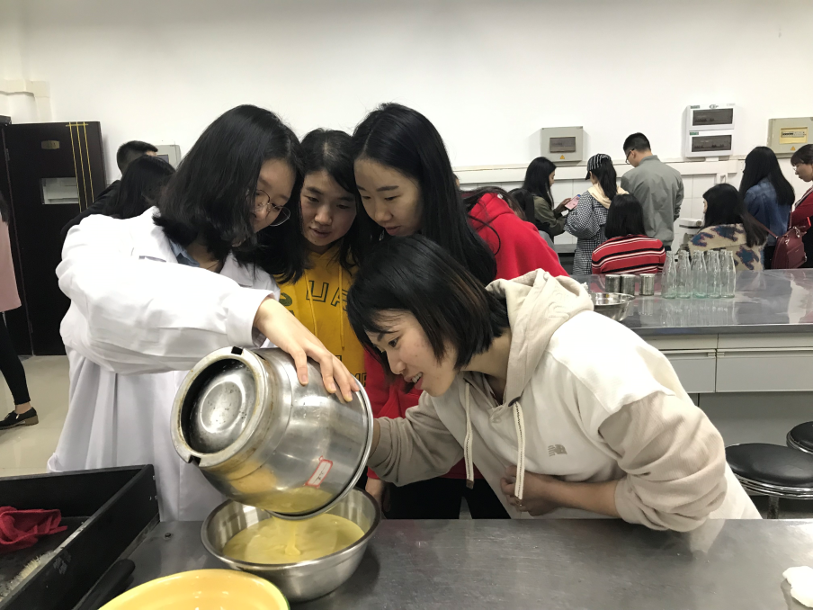 接下来,活动中开展了烘焙试验。在工作人员的带领下,同学们亲自体验配料、称量、搅拌、烘烤等一系列操作。该环节增强了活动的趣味性,加深了各学院的同学们对食品科学学院和食品学子们日常学习生活的了解。