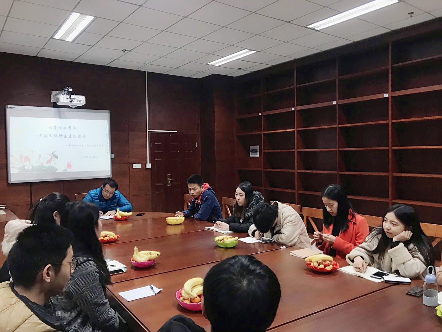 今年是学校第十四个民族节,为深入学习贯彻落实习近平新时代中国特色社会主义思想,庆祝改革开放四十周年,切实发扬改革开放精神,进一步促进各民族师生交往交流交融,巩固和发展平等团结互助和谐的社会主义民族关系。我院积极响应学校号召,于11月22日晚7点在中心图书馆四楼研修间举行以“改革开放四十载 民族团结奏华章”为主题的少数民族研究生座谈会。学院党委副书记武宇坤、研究生实习辅导员陶百祥及学院少数民族研究生参加了此次座谈会,会议由武宇坤副书记主持。