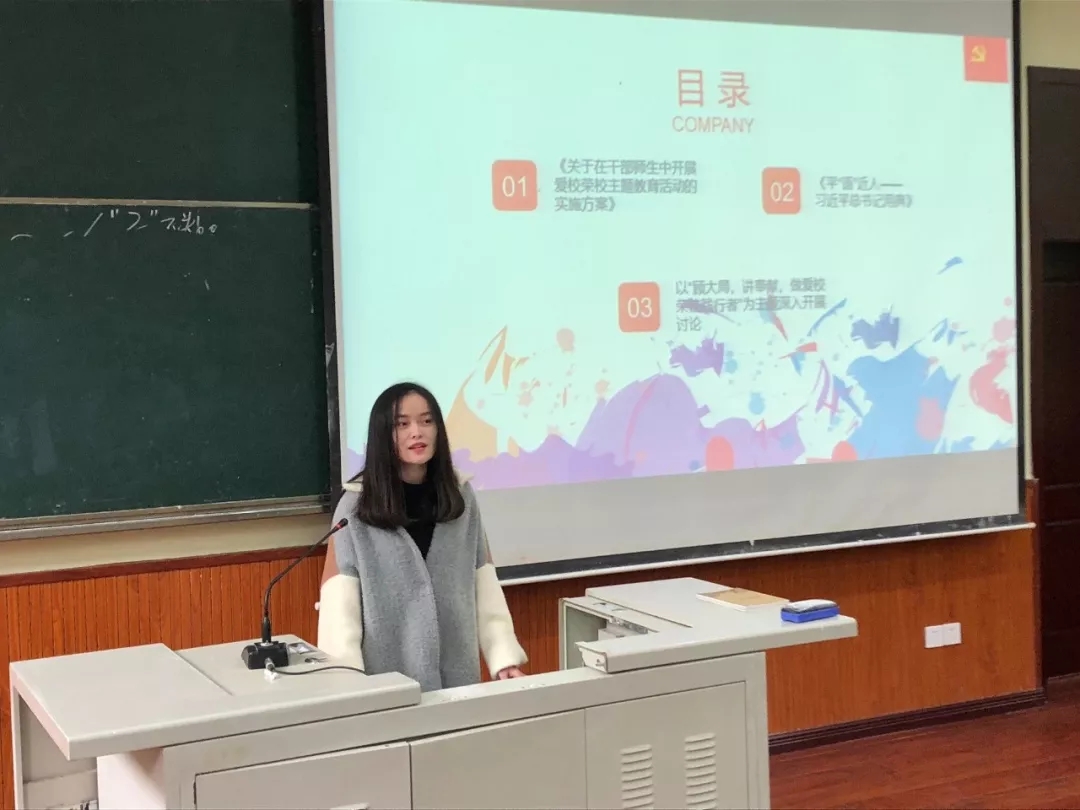 对《关于在干部师生中开展爱校荣校主题教育活动的实施方案》文件的学习,一共分为四部分。首先,黄琦思同志从开展“爱校荣校兴校”大讨论、“明校史·知校情”大学习、“传承西大精神”大宣讲三个方面,对“爱校·学习教育行动”进行了生动的讲解。她亲自参观了校史馆,并对校史馆的资源、环境等进行了内容梳理与图片呈现。其次,入党积极分子宫亚静同学对PA视讯的历史功勋人物、典型优秀学生以及优美的校园进行了介绍,阐释了“荣选:选树宣传行动”的三个主要内容:建功立业西大人、学行天下西大人、爱校荣校西大美。接下来,陈昊同志带领大家学习了 “兴校·岗位建功行动”的内容,分别讲解了“兴校强校建言献策”、“兴校强校建功立业”、“兴校强校文明创建”这些活动应如何开展。最后是陈茜楠同志强调了开展爱校荣校主题教育活动,要高度重视、抓好落实、精心组织、取得实效、创新形式、扩大影响。