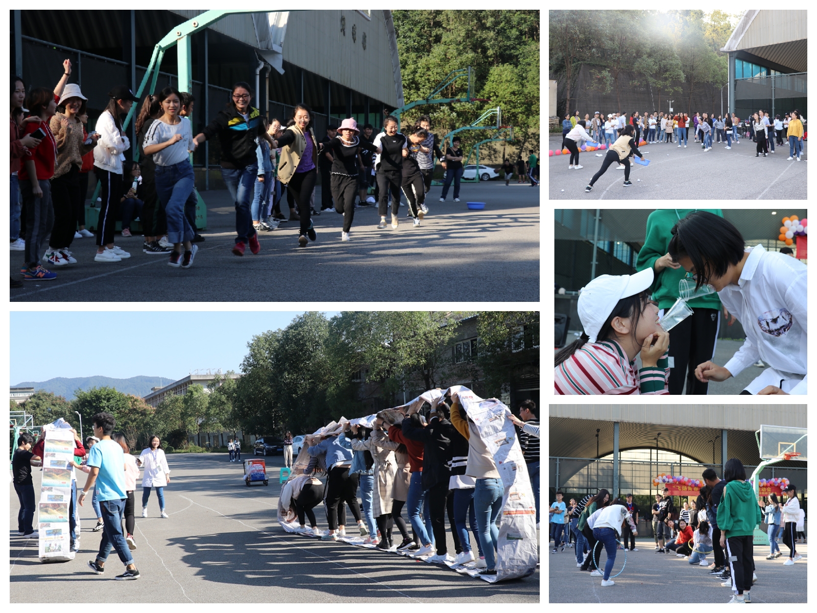 天公作美,天气一改往日的阴沉,艳阳初现,下午两点半趣味运动会正式开始。比赛主要分为五个环节:“坦克履带”、“穿越呼啦圈”、“滚雪球”、“大丰收”、“趣味接力”,每个环节由不同的小游戏组成。参赛选手都表现出了极佳的状态,观战同学的加油声也此起彼伏,场面热闹激昂。在“坦克履带”环节,队员们团结一致向前进,不时赢得场边观众阵阵喝彩。而“滚雪球”环节是速度与忍耐力的比拼,“穿越呼啦圈”、“大丰收”、“趣味接力”三个环节极具思维的创造力与肢体的协调力。不同环节精彩纷呈,技巧、竞技、乐趣并存,鼓励同学们合作参与,充分发扬团体合作精神。