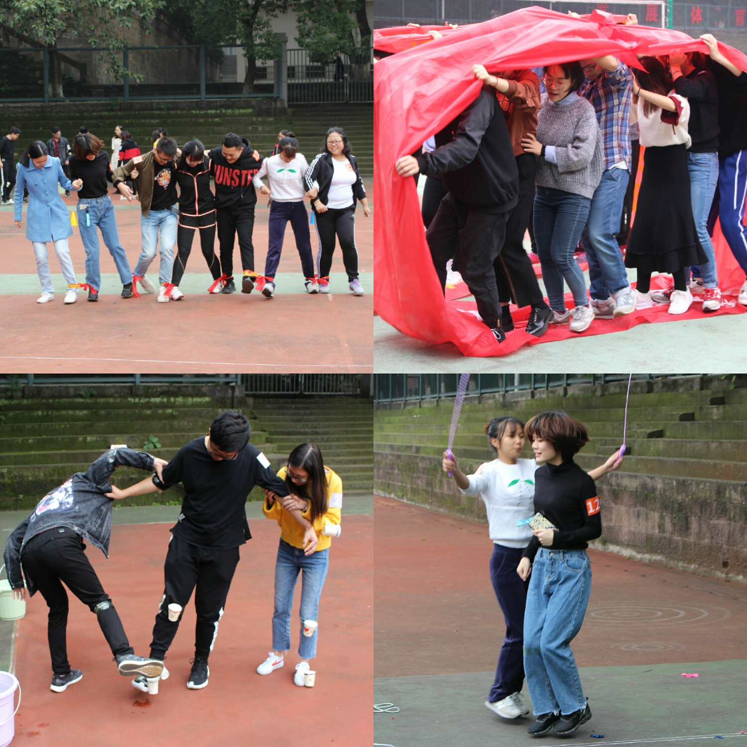 所有参赛人员集合完毕后,首先由主持人致辞并宣布本次趣味运动会正式开始。接着采取随机分组的方式将各学院的参赛人员随机组合,按相应的男女比例8人一组,共计12支队伍。分组完毕,由工作人员进行项目演示。本次趣味运动会共设有两人三足、沙漠取水、我是搬运工、车轮滚滚、铁人接力、力拔山河六个比赛项目。项目演示完毕,各队伍自由选择完成各个项目的顺序,每完成一个项目可根据完成情况获得一定的积分。比赛结果是将每12支队伍在六个项目中所获所得积分累加起来,分高为胜。