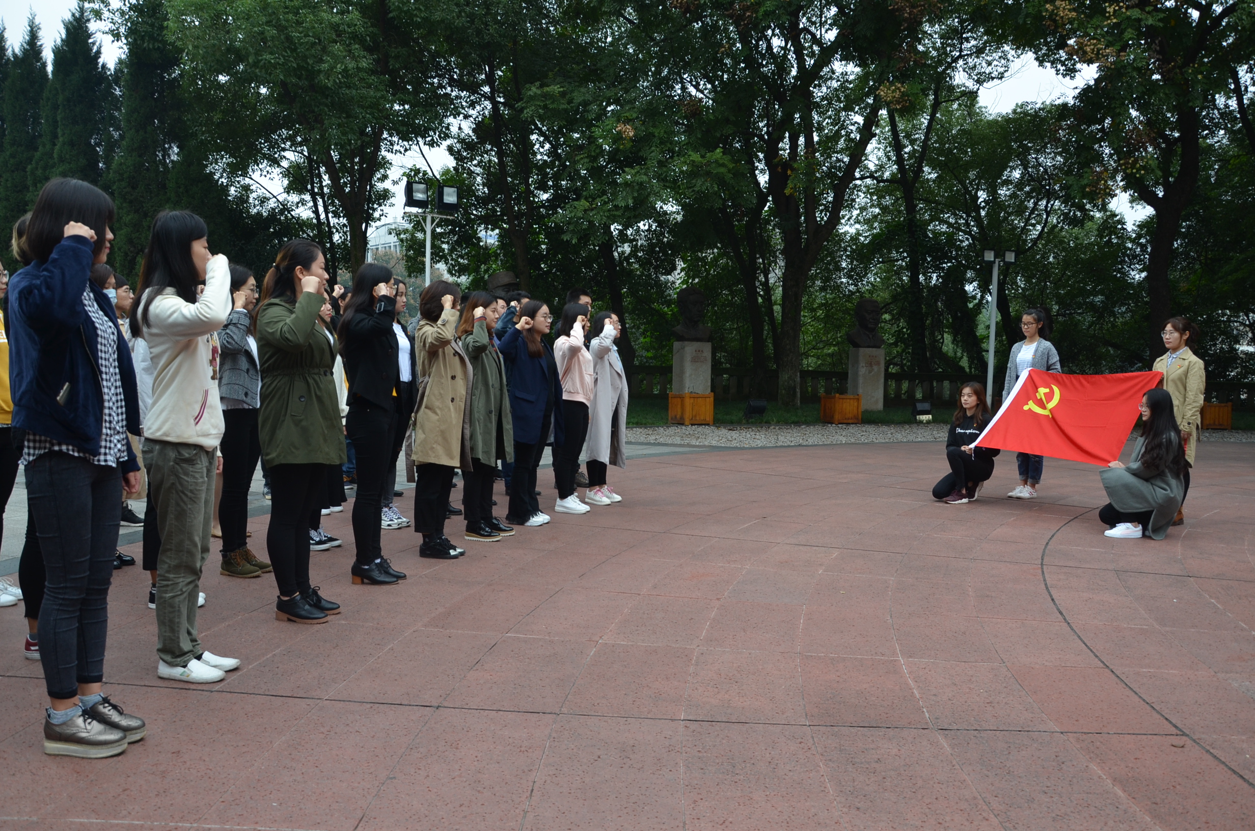 上午九点,红色教育基地红岩魂广场庄严肃穆浩气长存,全体研究生党员佩戴党徽,整齐而铿锵有力,面向党旗重温入党誓词:“我志愿加入中国共产党,拥护党的纲领,遵守党的章程,履行党员义务,执行党的决定,严守党的纪律,保守党的秘密,对党忠诚,积极工作,为共产主义奋斗终身,随时准备为党和人民牺牲一切,永不叛党……”在渣滓洞、红岩博物馆的驻足、观看和深思,同志们的心灵受到震撼,思想深受感染,对那段艰苦的革命岁月,对革命先烈救亡图存的爱国精神、不畏艰险的奋斗精神、敢为牺牲的奉献精神、同舟共济的团结精神报以崇高的敬意。在三峡博物馆,同志们在讲解员的介绍中概览了从《远古巴渝》到《重庆:城市之路》的历程,对改革开放40年来重庆取得的巨大发展感到由衷地钦佩和自豪,各种写实的文物、图片、记述,特别是三峡大坝的建设历史和场景,将同志们带入改革开放波澜壮阔的时代岁月,心情无比自豪,雄心万丈,纷纷表示“我们党太伟大了”、“祖国我为你自豪”、“我们终于强起来了”、“我们应该珍惜当下”、“趁着年轻我们应该努力奋斗”、“我们应该不负前人基业努力献身新时代”等等,也有同志讲到,“虽然已经不是第一次来参观学习了,但每次来都有别样的感受,心灵受到洗礼,理想信念更加坚定,党性又受到锻炼。”