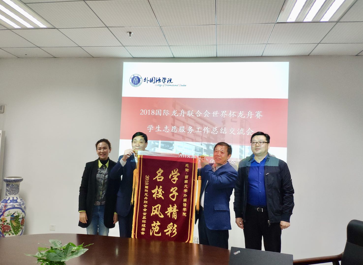左主任一行还带来了2018国际龙舟联合会世界杯组委会赠与PA视讯外国语学院的锦旗,这面锦旗是双方初次合作、建立友谊的美好象征。