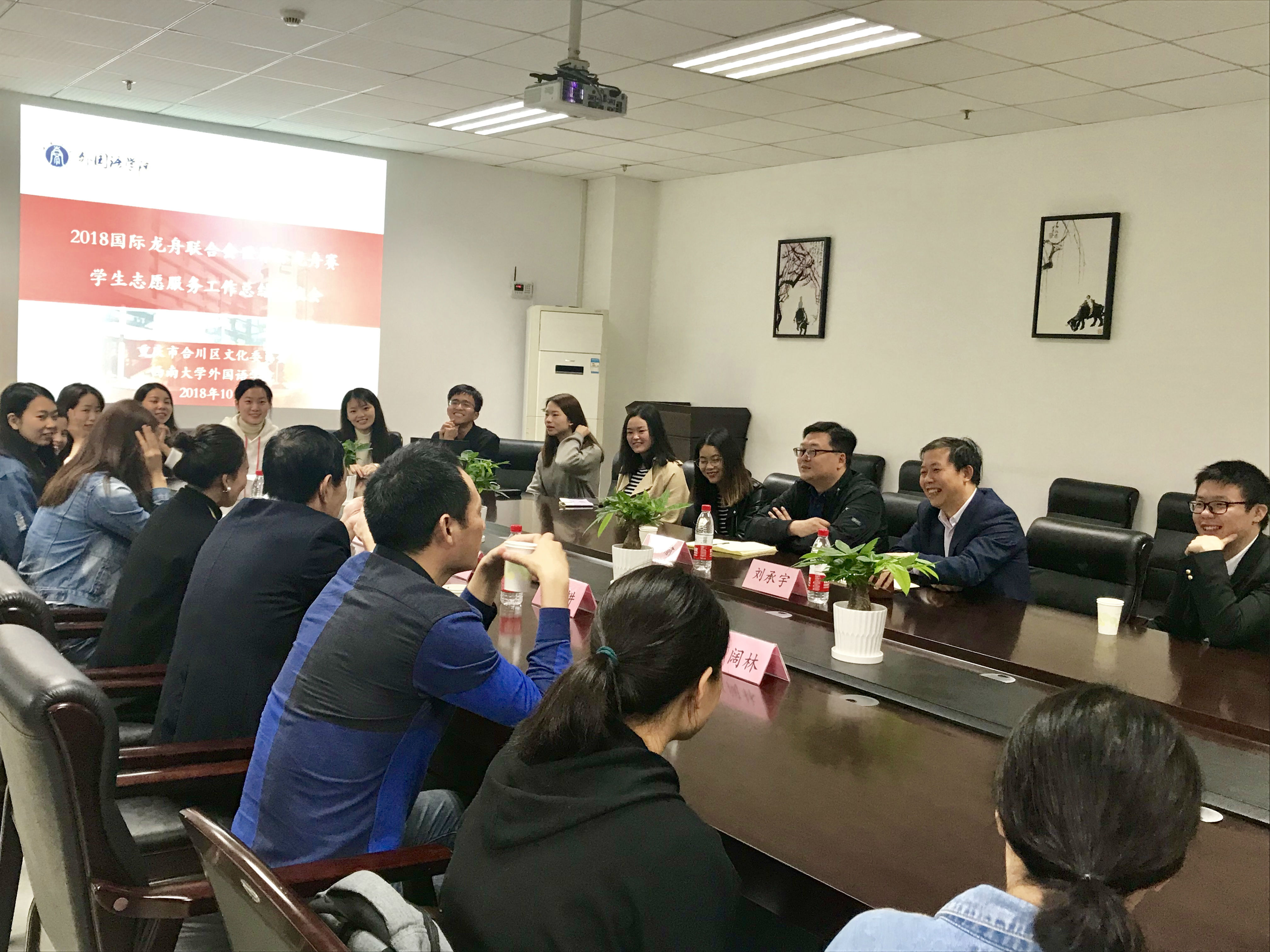 10月26日上午10点,第三届国际龙舟联合会世界杯学生志愿服务工作总结交流会于PA视讯外国语学院313会议室成功举办。合川区文化委员会主任左学耕,合川区文化委员会党组成员刘洁,合川区国民体质监测中心科长彭阔林,外国语学院院长、博士生导师刘承宇,外国语学院党委副书记、纪委书记陈渝出席了本次交流会。此外,全体龙舟世界杯学生志愿者也参与了总结交流会。