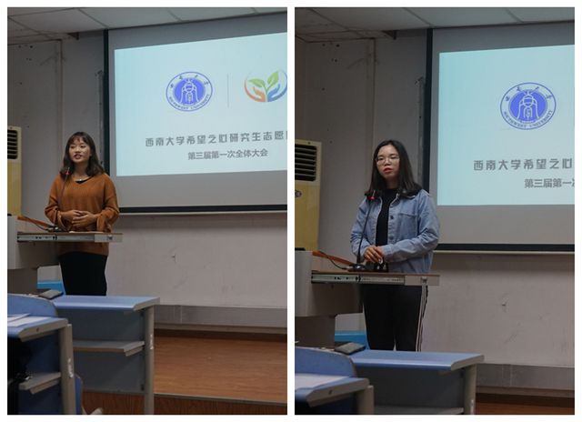 其次,“希望之心”第三届大队长张玉玮进行发言,向新老成员介绍志愿团队的整体情况以及新学期的工作计划,并组织全体成员签订志愿承诺书,希望大家用心浇灌希望之心这颗爱心的种子,使之不断发展壮大。接着,两位副队长对宣传和财务工作进行了详细的汇报。