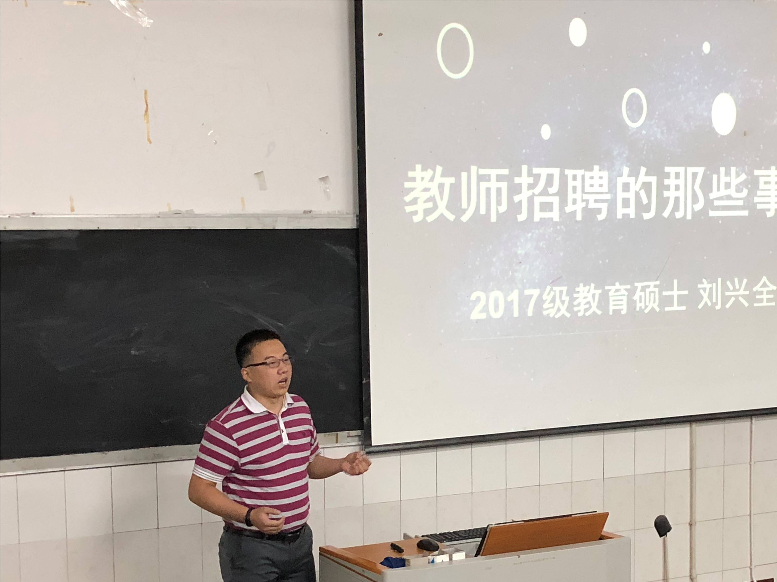 作为一名教育硕士,刘兴全围绕“教师招聘那些事儿”对教师行业的情况进行全面讲解,为同学们指点迷津,分享教育教师技能,并表示到:“要想成为一名合格的教师,首先要有一颗热爱教师这份工作的心,其次要有丰富的知识储备和技能储备,对教师来说如何高效地把知识传播出去是十分重要的。”