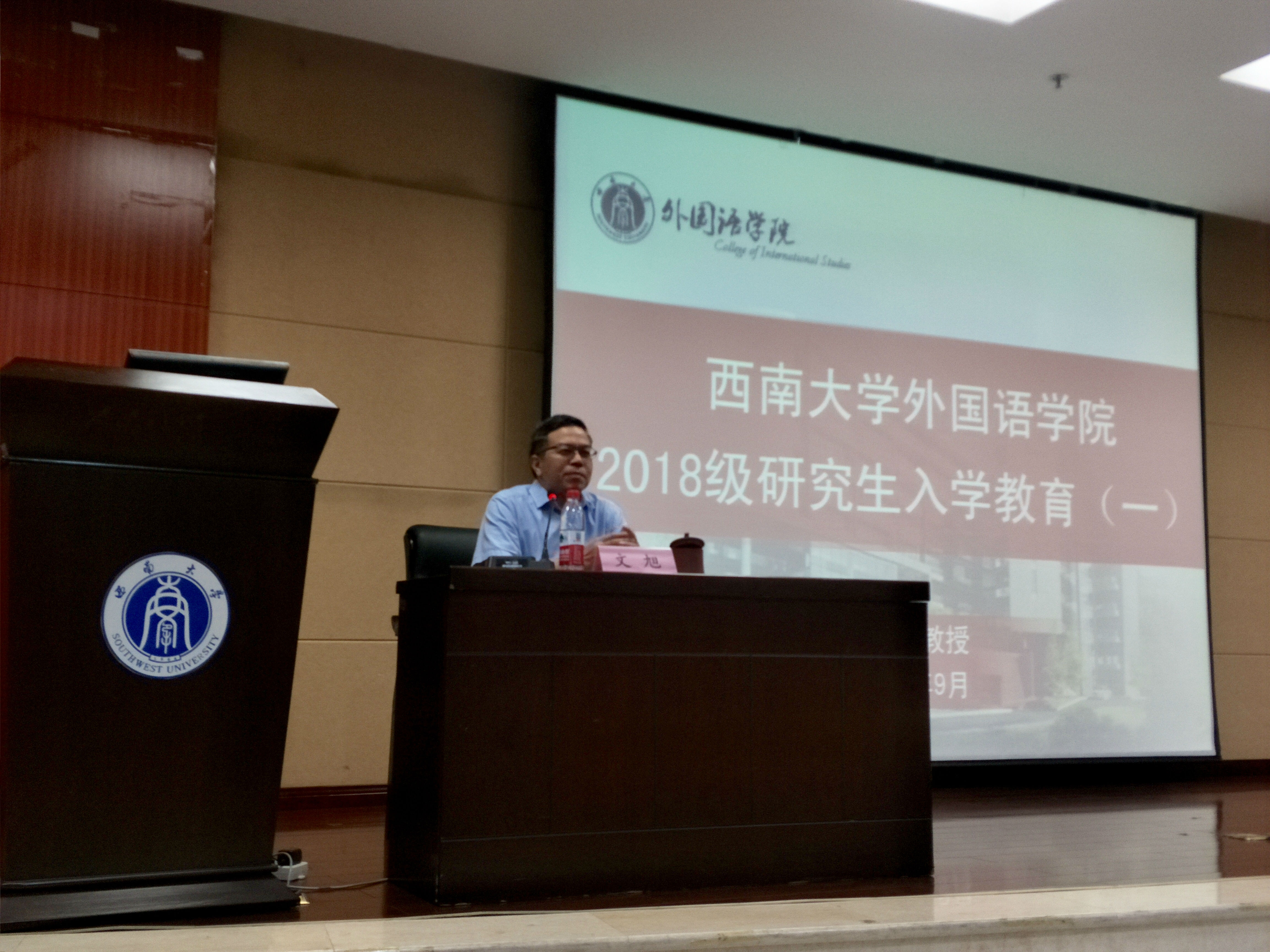 9月10日上午9点,外国语学院党委书记、博士生导师文旭教授以“校史校情教育”为题,拉开了系列讲座的帷幕。文旭教授提到,“博学中西、砥砺前行”是西大外院的院训,外院学子应在怀有反哺之心的前提下不断学习,应在拥有理想信念的前提下奋勇前行。会场掌声连连,气氛融洽。
