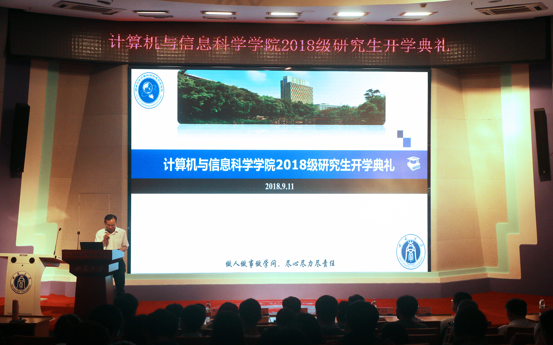 计算机与信息科学学院2018级研究生开学典礼于9月11日上午在25教学楼一楼报告厅隆重举行。学院党委书记靳拥军、院长肖国强、党委副书记刘作勋、副院长陈武、副院长韩毅出席典礼。到场的还有部分研究生导师及2018级全体研究生新生,典礼由学院党委副书记刘作勋书记主持。