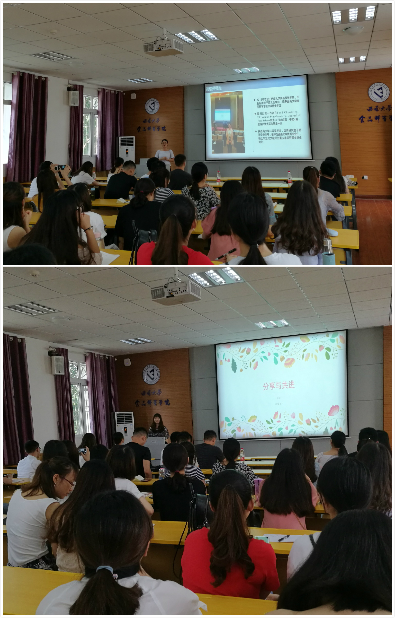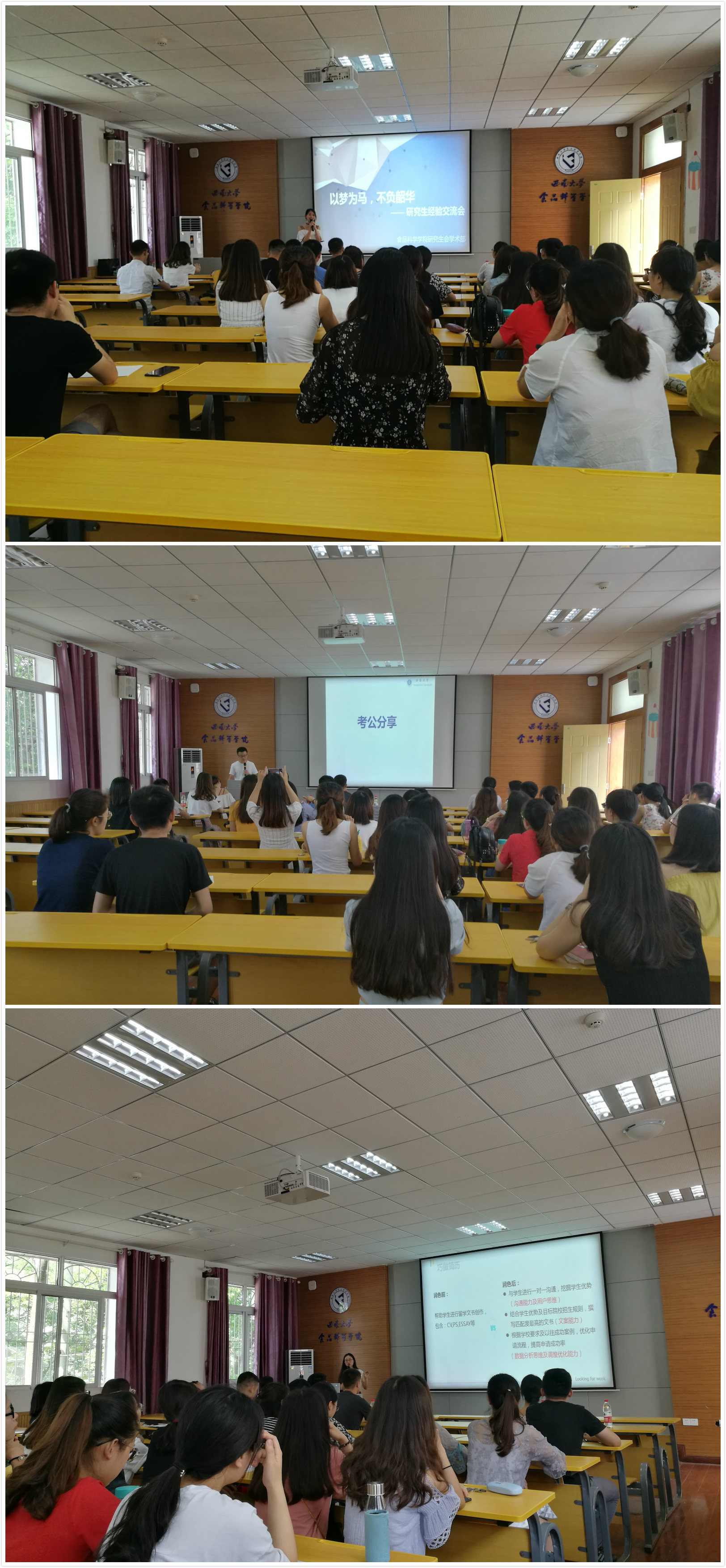 以梦为马,不负韶华。2018年6月7日,由食品科学学院学术部主办的研究生经验交流会在39教315举行。研究生师姐李双红、研究生师兄张晨曦、张东以及博士师姐张媛、高瑞萍作为应邀嘉宾与大家进行经验交流,低年级研究生参加。
