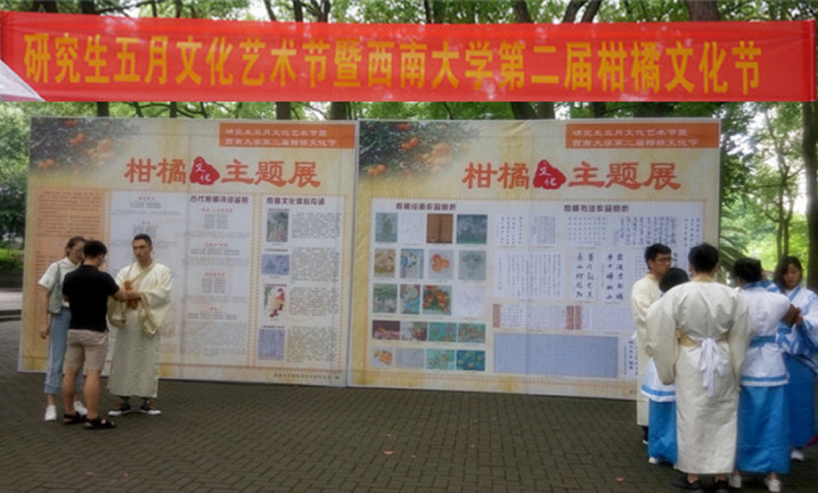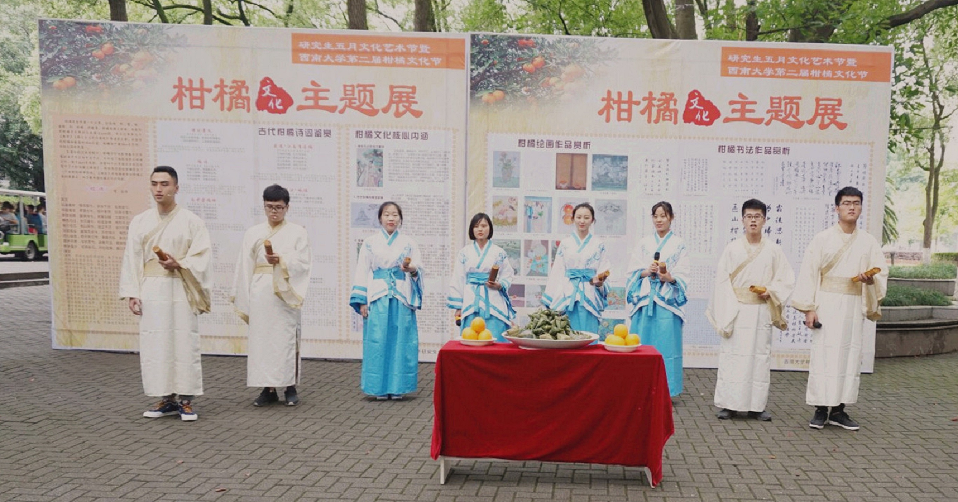 为了进一步浓郁校园里纪念屈原、弘扬爱国主义精神的文化氛围,同学们还在校园里举行了纪念屈原的仪式,大家身着古装,手系五彩绳,并执竹简,在活动现场诵读了《橘颂》。此外,还以书法、绘画等形式广大师生展示了《橘颂》中蕴含着的柑桔文化核心精神,其中包括受命不迁的忠贞精神、行比伯夷的高洁品德、怀橘遗亲的孝顺情操、橘井泉香的仁爱之心。