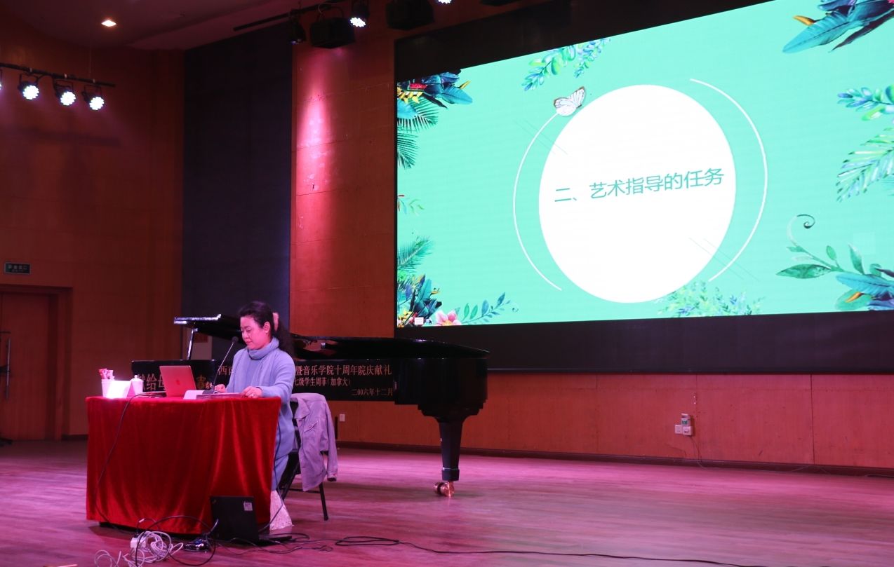北村香织教授给同学们讲述了声乐艺术指导的四方面内容,分别是艺术指导的概念、任务、作品演绎与比较。关于艺术指导的概念。北村香织教授从分别从艺术素质与音乐修养、钢琴演奏技巧与音乐表达能力,以及对音乐的概括能力、说服力和统帅能力这几方面进行界定。她说,作为一名艺术指导,要具备上述几种关于音乐的素养和能力才能对作品进行比较深入的理解和把握。