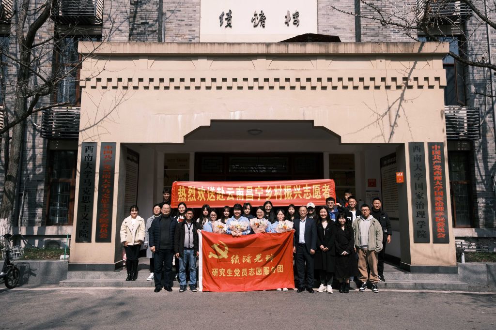 无论时代如何变迁,雷锋精神永不过时。为学习贯彻习近平总书记对深入开展学雷锋活动重要指示精神,壮大学雷锋志愿者队伍,持续做好云南昌宁乡村振兴定点帮扶工作,新学期刚开学,国家治理学院“绩镛先锋”研究生党员志愿服务团乡村振兴小分队整队出征,学院在绩镛楼前举行了隆重的出征仪式。学院院长潘孝富、党委副书记李长松、副院长郭美云、导师代表陈纬、研究生辅导员汪全洲以及部分研究生代表参加,党委副书记李长松主持仪式。