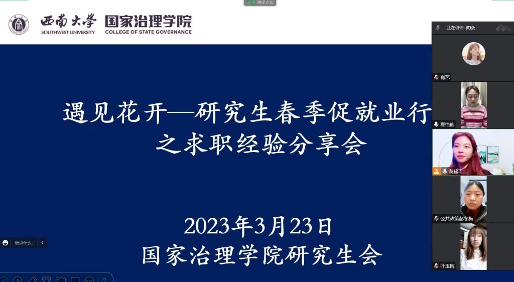 为加快推进2023届研究生毕业生的就业指导工作,为在校研究生提供更好的就业指导服务,激发毕业生就业活力,3月23日晚,学院以线上会议的形式开展“遇见花开”研究生求职经验分享会。学院百余名研究生线上参加。会议由研究生会团委副书记黄秘主持。
