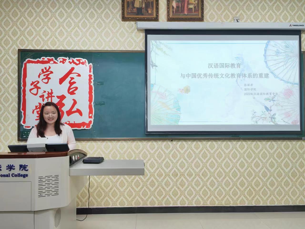 张丽君同学首先通过引用党的二十大报告中关于传承中华优秀传统文化的论述,说明了传承中华优秀传统文化的重要性。接着,她分析了优秀传统文化蕴含的精神教育需求。最后,她有针对性地提出了重建汉语国际教育与中国优秀传统文化教育体系的路径。