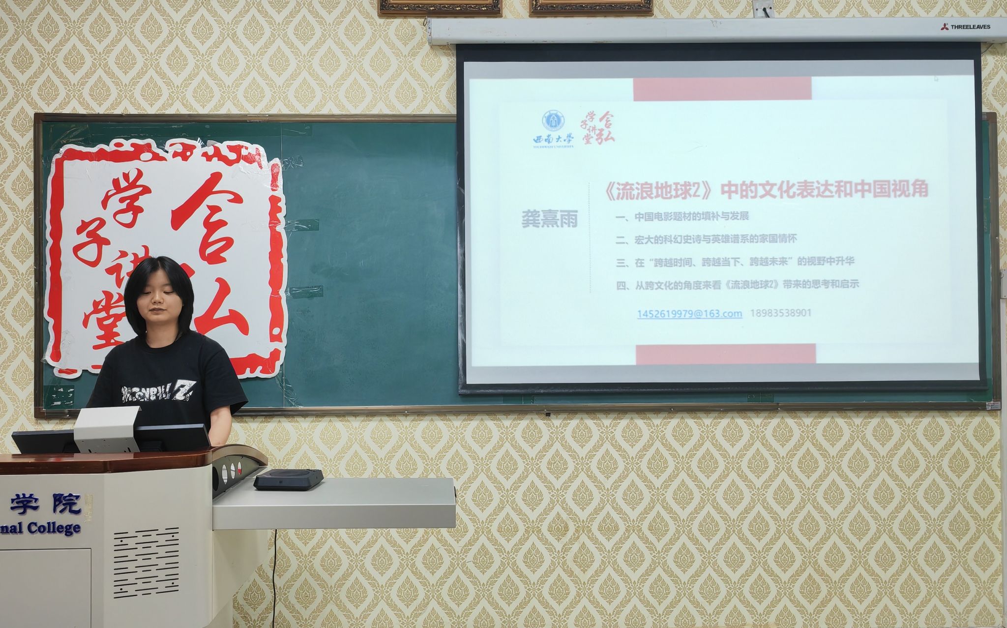 龚熹雨同学从剖析《流浪地球2》蕴含的文化价值入手,提到其不仅是对中国电影题材的填补与发展,同时体现出中国人的家国情怀。再从中国人的集体主义、乡土情怀和人类命运共同体等多维度对影片内容进行细致地分解,一步步追溯其中隐含的中国视角和文化内涵。