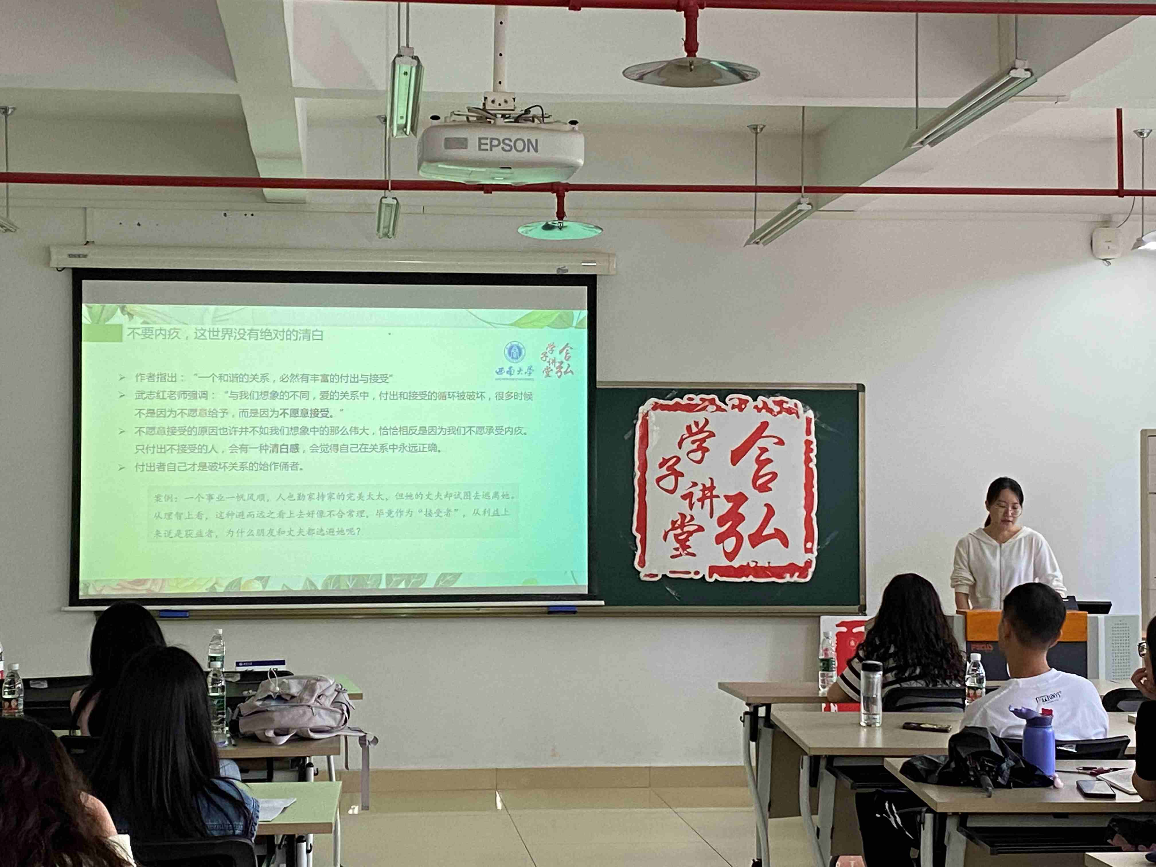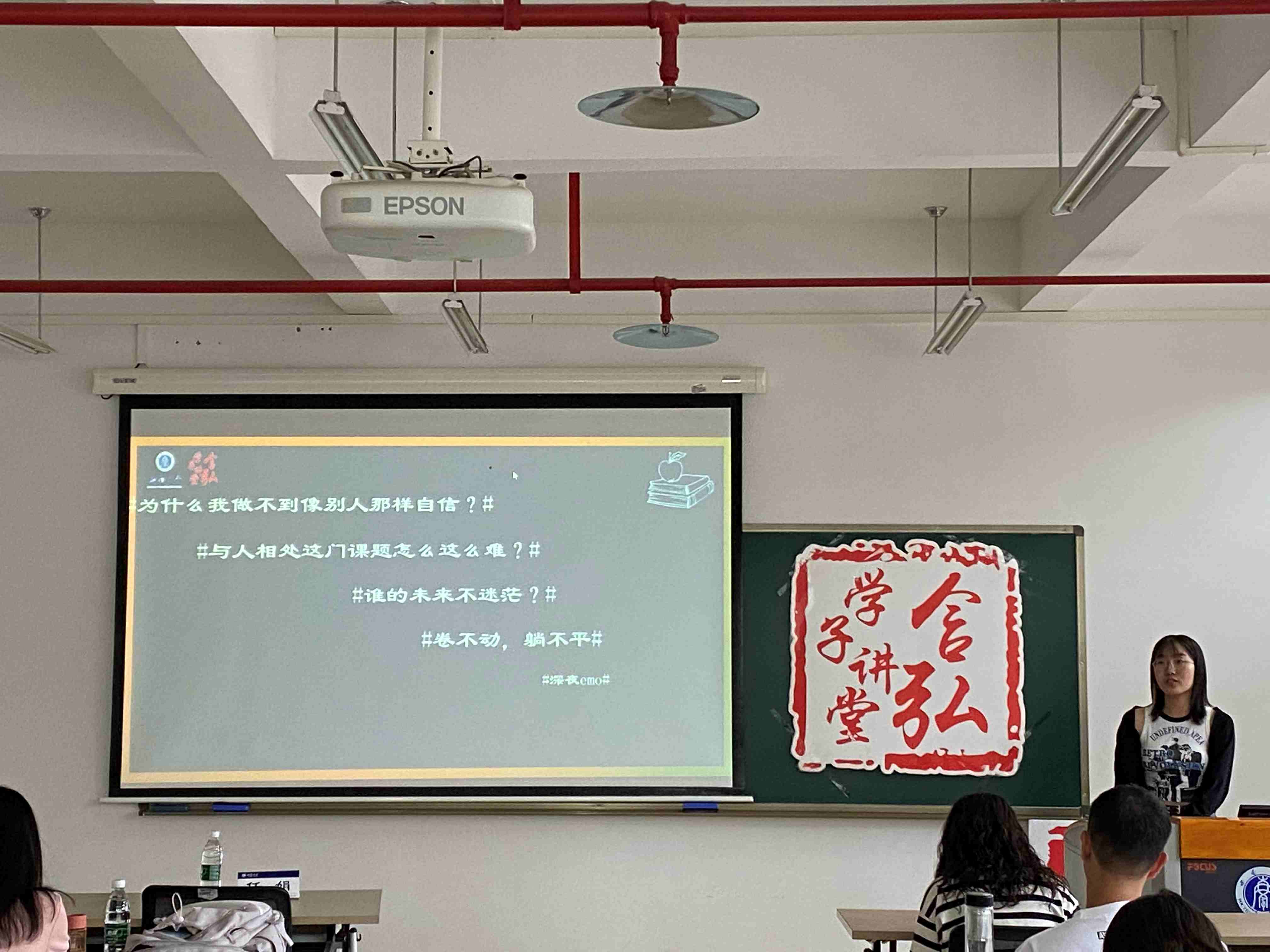 刘芮含同学分享了《感谢自己的不完美》一书。此书围绕痛苦、悲伤、愤怒、恐惧等负面情绪展开,并从心理学角度分析认为这些坏情绪对人们也有极大的帮助和正面意义。首先,她以余华的名言“世界上的事情,最忌讳的就是十全十美。凡事总要稍留欠缺,才能持恒”来引出“不完美构成了我们真实的生活”的分享主题。随后,她从悲伤、愤怒、内疚、恐惧等情绪出发对该书进行解读,并鼓励同学们在日常生活中感谢自己的不完美。最后,刘芮含同学指出要学会正视和拥抱自己的负面情绪,积极面对真实的生活。