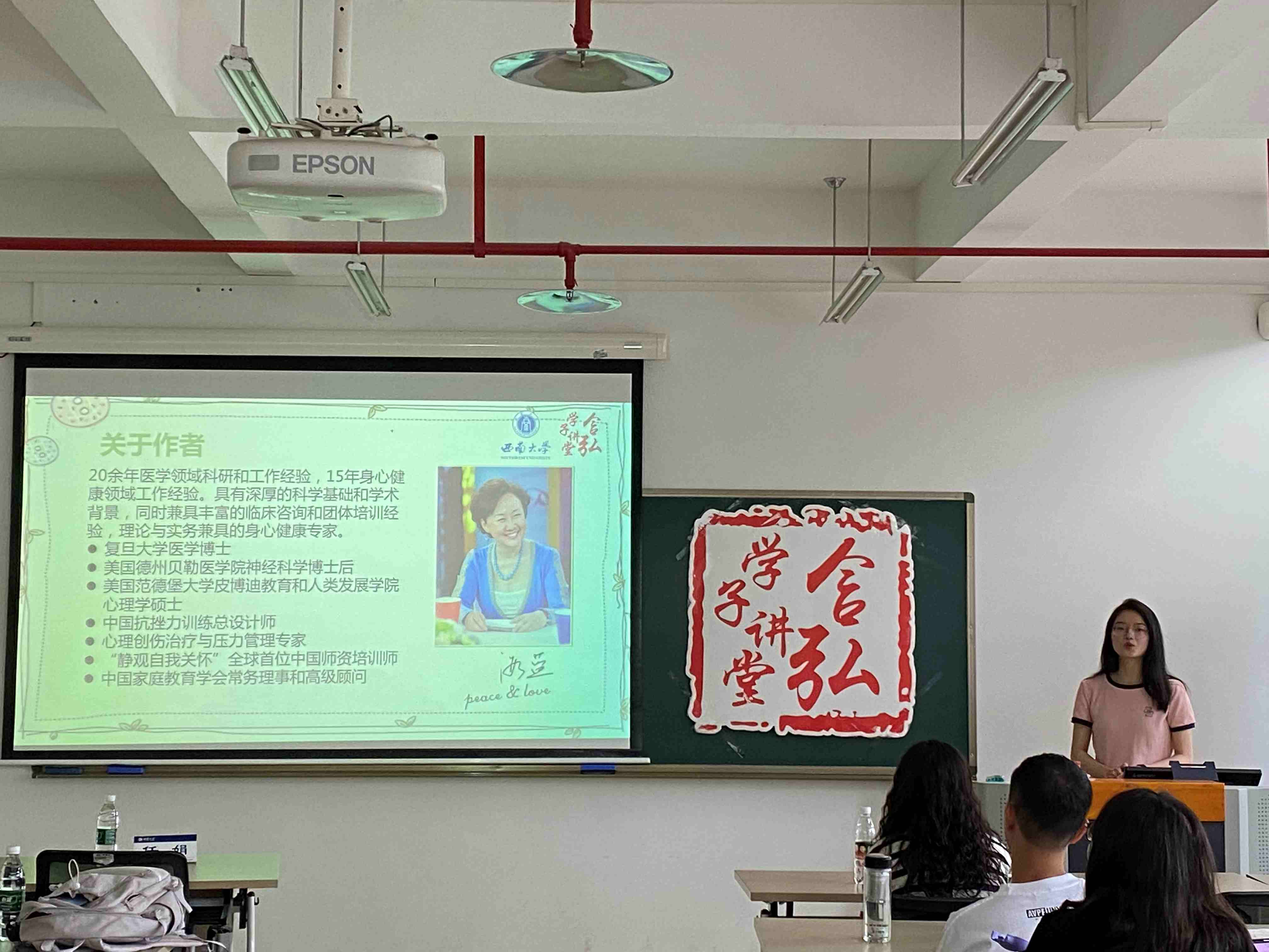 蔡艾霖同学分享了《人间值得》一书。她首先从日常生活中五大焦虑情景引入主题,随后从人际关系、自我心态、焦虑情绪三个方面详细剖析了恒子奶奶的人生态度以及带给她的深刻感悟,让大家领悟了对生活中的小事心存感激、恰到好处的人际关系、脱离内耗的精神状态、生活与工作的平衡之道等人生智慧。最后,她以此书两大基调“平静”与“坦然”作结,并借此勉励同学们学会及时释放压力,疗愈心灵。