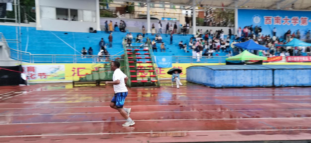 田径赛场上,黄无为老师和仇淼老师满怀热情,自信满满。枪声一响,如脱弦之箭,健步如飞,你追我赶,争当先锋。
