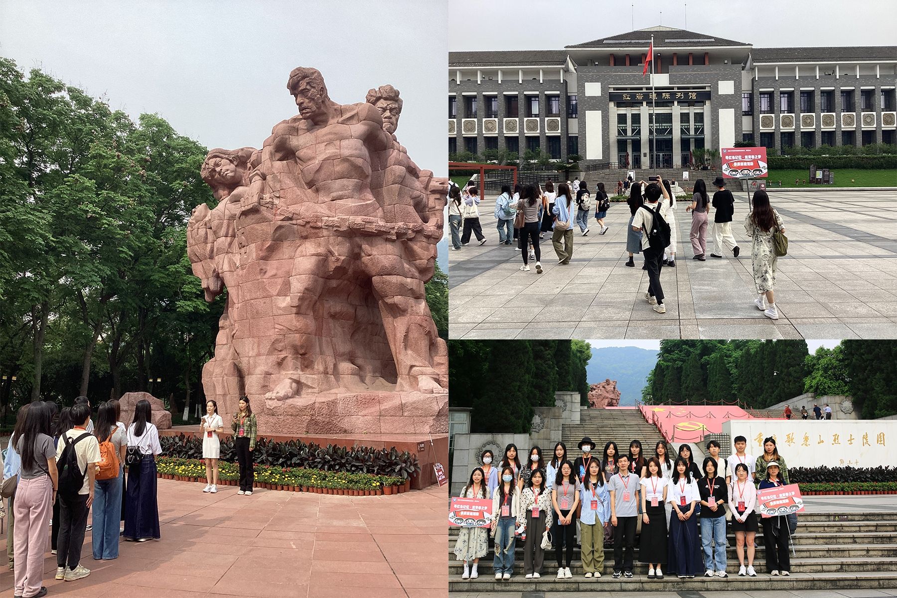 第一站,歌乐山烈士陵园。革命烈士陵园松柏环抱、绿荫满园,同学们站在歌乐山烈士群雕下方的阶梯前,仰望在前方的红旗与阶梯旁的烈士纪念章,迈步上前,仰头环行,凝望着由九位革命志士组成的石雕连环,感受烈士们平凡中的那份伟岸。“我渴望自由,但我深深地知道——人的身躯怎能从狗洞子里爬出”,到达群雕之下,同学们集体朗诵诗歌《囚歌》,感悟革命先烈那气壮山河的革命气概。