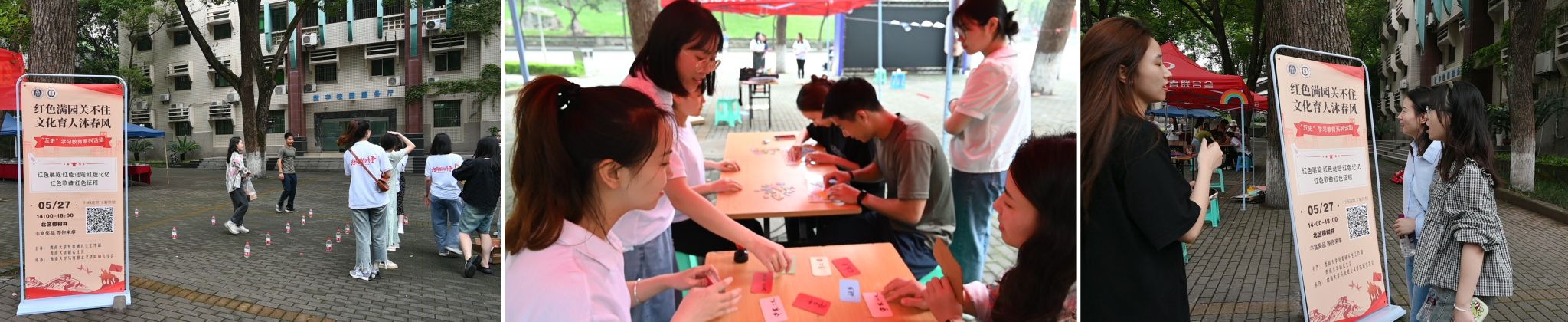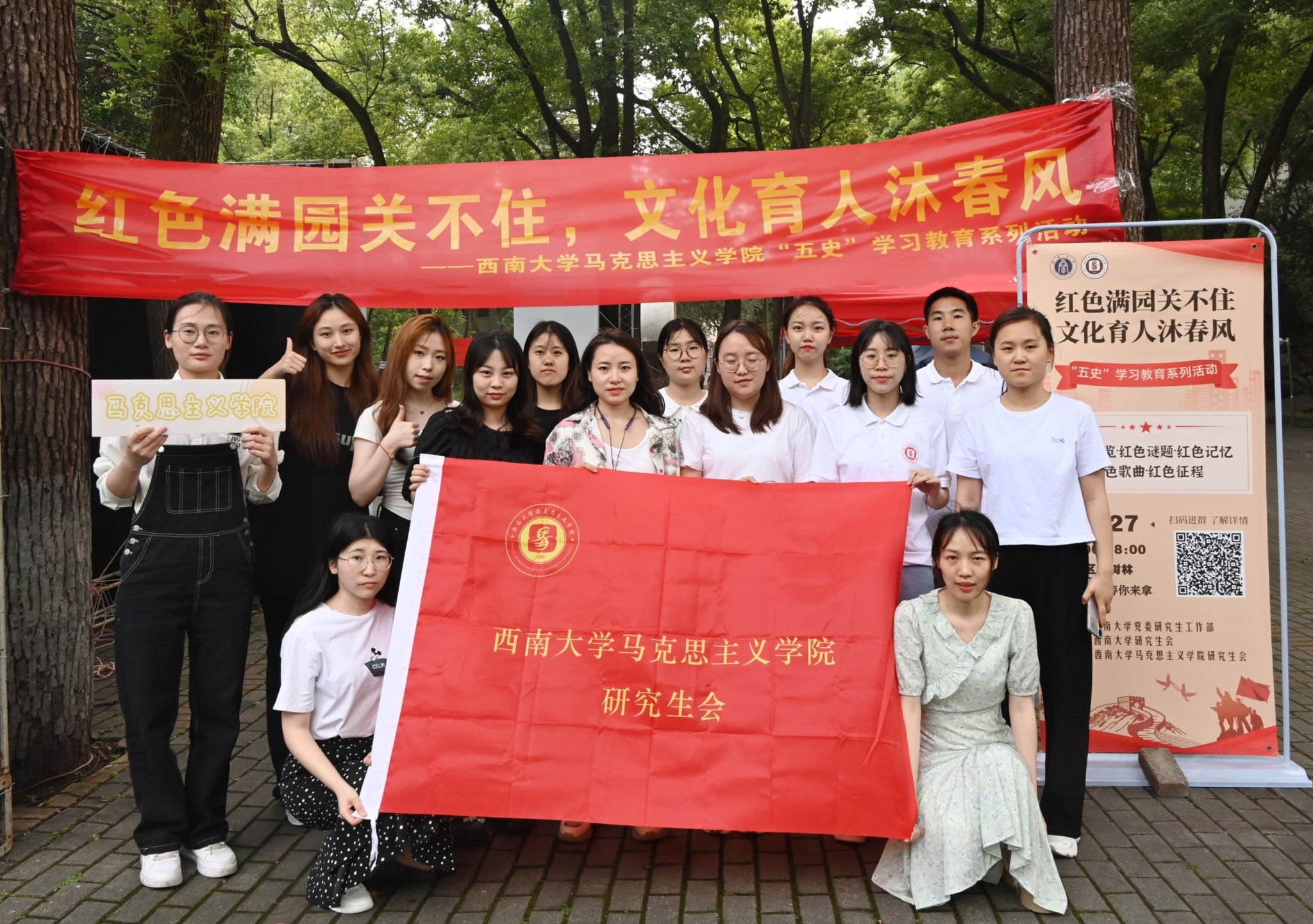 为深入推进学习贯彻习近平新时代中国特色社会主义思想主题教育,加强“五史”学习教育,充分发挥红色文化建设在培育和践行社会主义核心价值观中的重要作用,引领新时代青年学史明理、学史增信、学史崇德、学史力行,5月27日下午,PA视讯马克思主义学院研究生会在北区樟树林开展“红色满园关不住,文化育人沐春风”“五史”学习教育系列活动。
