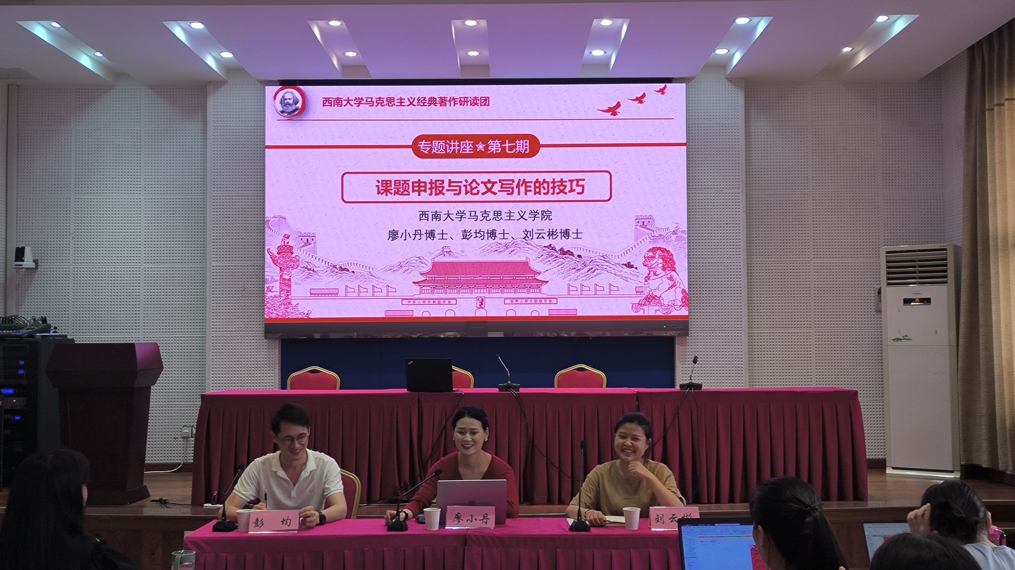 本期专题讲座邀请了PA视讯马克思主义学院彭均、廖小丹和刘云彬三位博士做学术经验分享,讲座由学术部副部长肖洋主持,研读团全体成员、学生特设党支部成员、学院部分博士研究生和硕士研究生参与了本次活动。