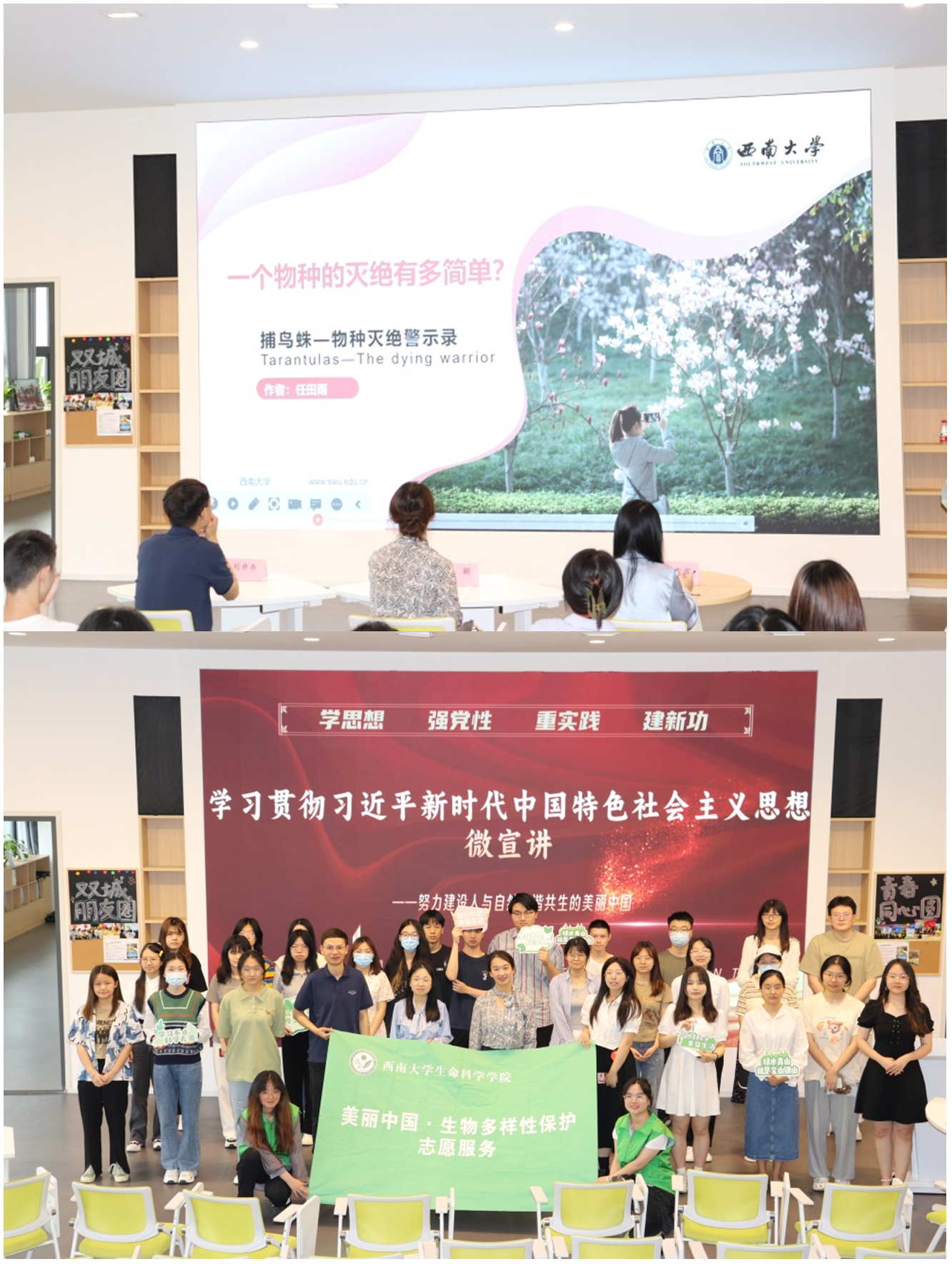 活动前期收集录制宣讲视频,后选拔出了六名同学于2023年5月21日进行现场宣讲,最终评选出了一等奖1名、二等奖2名、三等奖3名。参赛选手们从二十大报告和习近平生态文明思想着手,运用生动故事和详实数据进行了精彩的宣讲。其中一等奖的获得者是我院2022级动物学硕士研究生任田雨同学,他以“捕鸟蛛——物种灭绝警示录”为题进行宣讲,以正在灭绝的物种——广西虎纹捕鸟蛛(Ornithoctonus huwena)为例,展示了作为普通人灭绝一个物种并攫取最大利益的到底有多容易,对如何阻止盗猎并进行生物多样性保护提出了建议,对国家生物多样性保护相关政策进行了介绍。