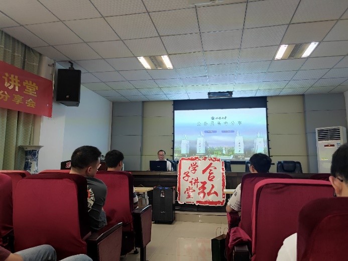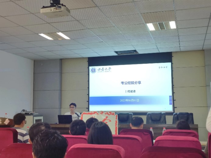 曾舜柯同学从六个方面分享了自己的公考经验。他分享的内容主要包括:第一,明确目标。他认为要以内心真正的想法作为目标,这将会成为自己坚持下去的依靠;第二,要有坚持的毅力。公考种类多,准备时间较长,他建议大家要做好持久战的准备,拒绝一切诱惑;第三,要有良好心态。他分享了自己落榜的经历,总结了最后上榜的经验,以切身体会鼓励大家在整个公考过程要有良好的心态;第四,合理安排时间。他提出要合理分配复习时间,可以从国考复习入手。其次,要合理分配每天公考和科研学习的任务,刷题后要进行总结。最后,要注意适当安排休息时间,劳逸结合;第五,要找到适合方法。他总结了做题顺序和做题时间以及平时积累三个重要方法,供同学们参考;第六,要有必要的外力。在备考时,外界帮助不可缺少,他向大家推荐了可以得到帮助的刷题软件、机构和知名刷题博主等。