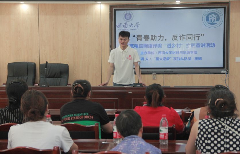 7月6日下午,实践队在村委会利用多媒体开展了“青春助力,反诈同行”防范网络诈骗进乡村主题宣讲活动。