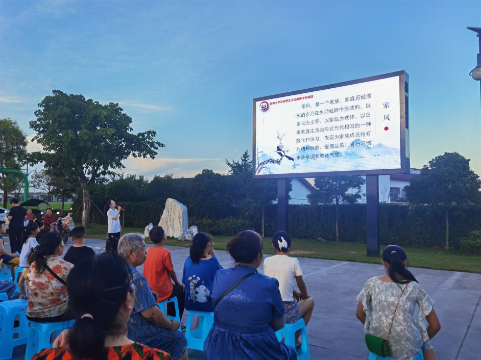 赖舒涵同学以“家风家教知识竞答”的形式,引出第一个宣讲主题——“弘扬传承好家风”。她用通俗易懂的语言,向大家阐述优良家风家训的重要性,引人深思,予人启迪。随后她借助击鼓传花的游戏,邀请村民分享自己的家风故事,增进了村民对优良家风的认同和感悟。