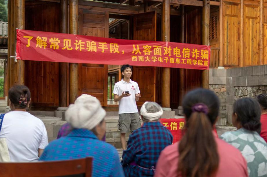 7月11日上午,实践队在华溪村开展了一场防范电信诈骗的宣讲会。队员们前往华溪村平日最热闹的赶集点,布置宣传横幅,为群众分发了印有预防电信诈骗的扇子,同时为老人们讲解传单上的内容。在宣讲过程中,村民们认真听讲并踊跃发言。宣讲完毕后,队员们还与当地居民一起进行了有奖知识问答。此次活动不仅让华溪村的居民了解到了新型电信诈骗的可怕之处,同时也通过科普让居民掌握了预防电信诈骗的有关知识。
