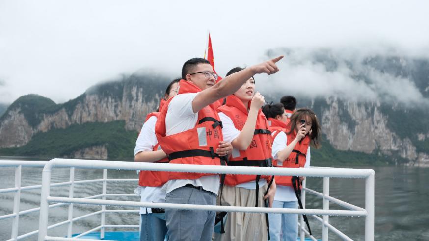 “守住发展和生态两条底线,努力走出一条生态优先、绿色发展的新路子”是习近平总书记在视察化屋村码头时为当地发展指明的方向。往日“靠水吃水、捕鱼为生”的化屋村村民沿着这条“新路子”,积极响应政府号召,最终从实现了“捕鱼船”到“旅游船”的升级转型。在这场“换船故事”中,尤荣学、尤荣文和尤荣利三兄弟则是村里最先端上旅游饭碗的人。三兄弟原本以务工和捕鱼为生,收入微薄,但在政府推出禁渔政策后,他们实施退捕,响应政策,及时抓住机遇,回乡成立了画廊航务有限公司,依托家乡秀美的山水,吃上了旅游饭。此外,他们还主动承担起江面垃圾清理工作,尽心尽力维护乌江生态。“石榴籽”暑期社会实践队也坐上了尤氏兄弟的游船,船头碧波涛涛,船尾红旗飘飘。千仞峭壁沿河陡立,一片澄净的江面上,身着救生衣的护河员划着小舟打捞着水中垃圾,这山清水秀的美景背后,我们看到的是化屋村成功走出的“新路子”——不仅修复了受损的生态环境,恢复了“绿水青山”,更是将“绿水青山”打造成了闻名遐迩的“金山银山”,化屋村也因此成为了乡村振兴的成功典范。