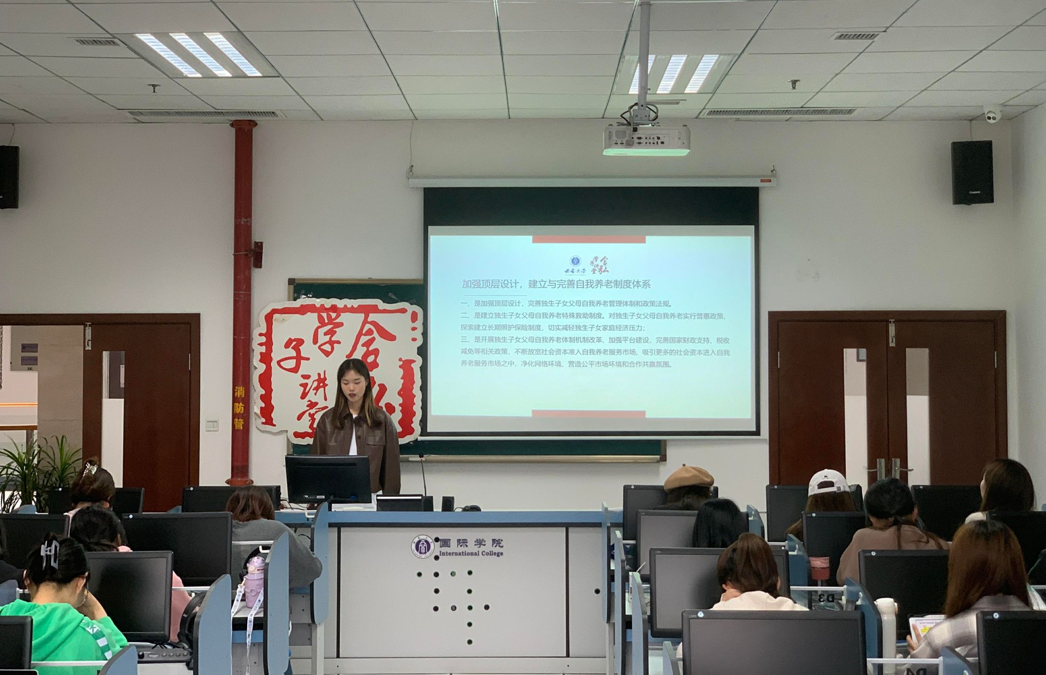 孟婷同学探讨了当下的热点“人口老龄化和养老问题”,目前,我国已经进入“老龄化社会”,如何精准应对养老压力,使其老有所养,老有所乐,老有所归,是非常重要的社会问题。孟婷同学以“自我养老”为重点,并从分析问题、解决问题的思路出发,提出见解,进行宣讲。首先从四个方面具体剖析了我国独生子女父母养老目前面临的挑战;其次,从多方面提出解决当下我国独生子女养老问题的重要方式;最后,倡导积极应对老龄化理念,提升自我养老意识,从而实现老年人幸福的、有尊严的高质量晚年生活。