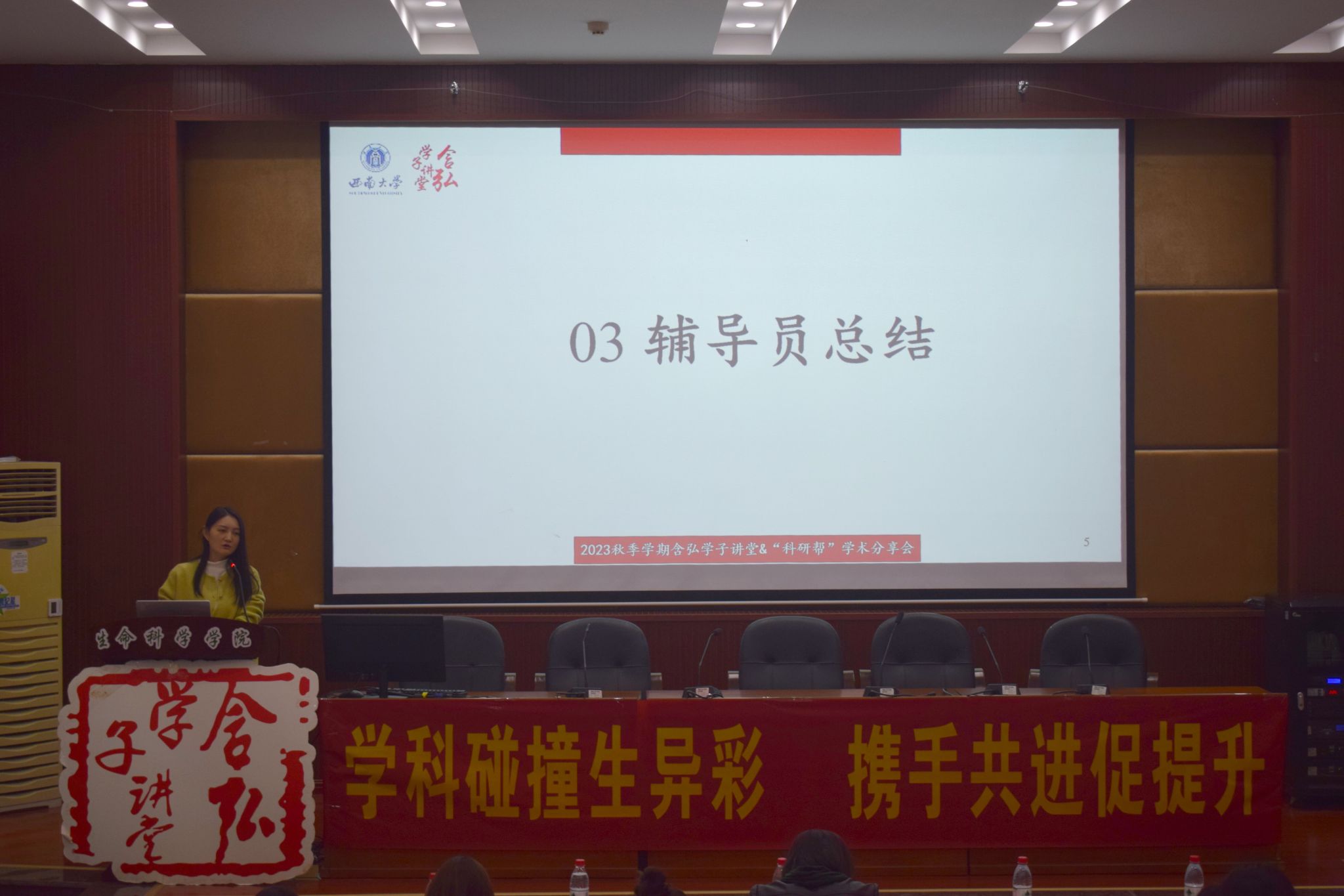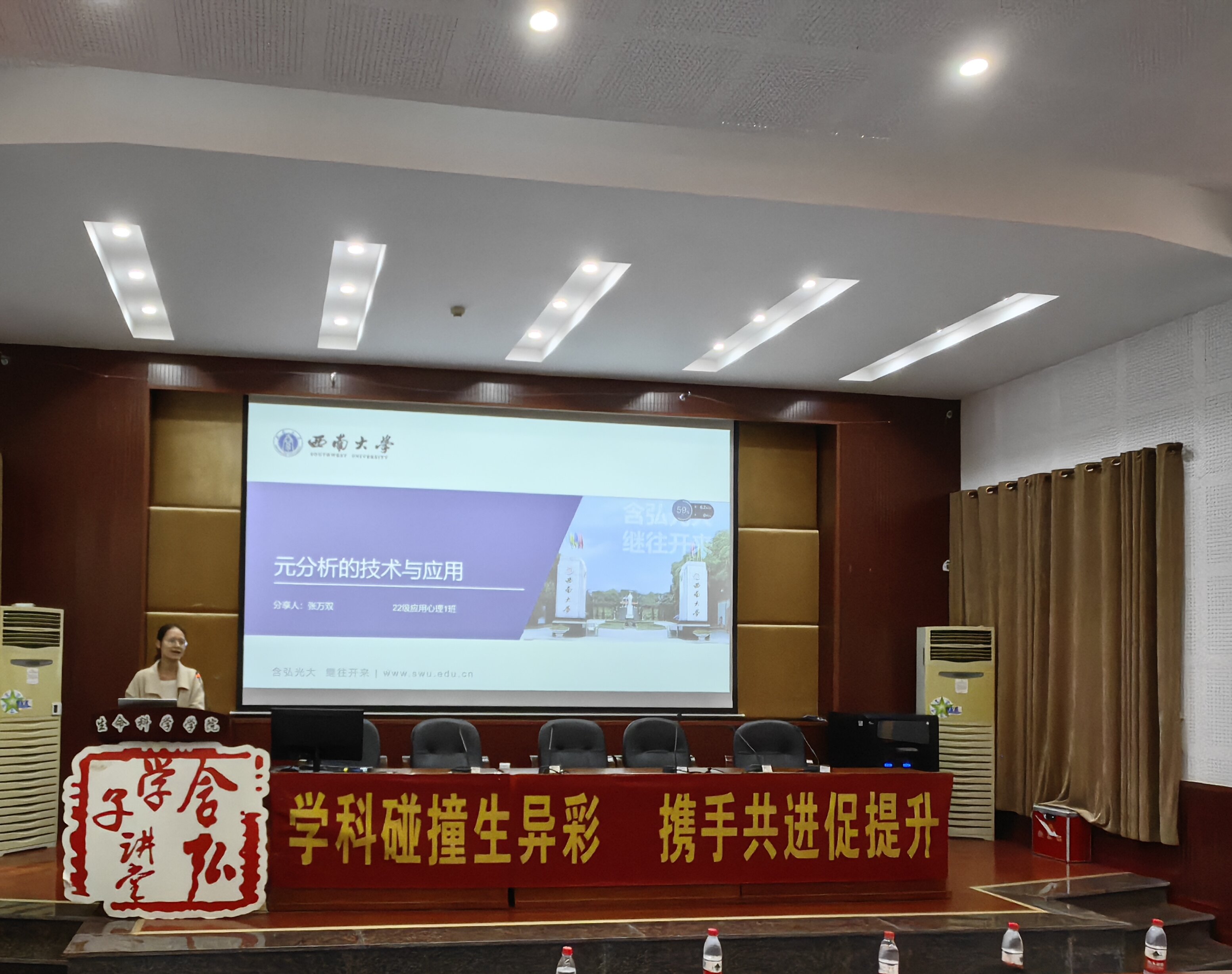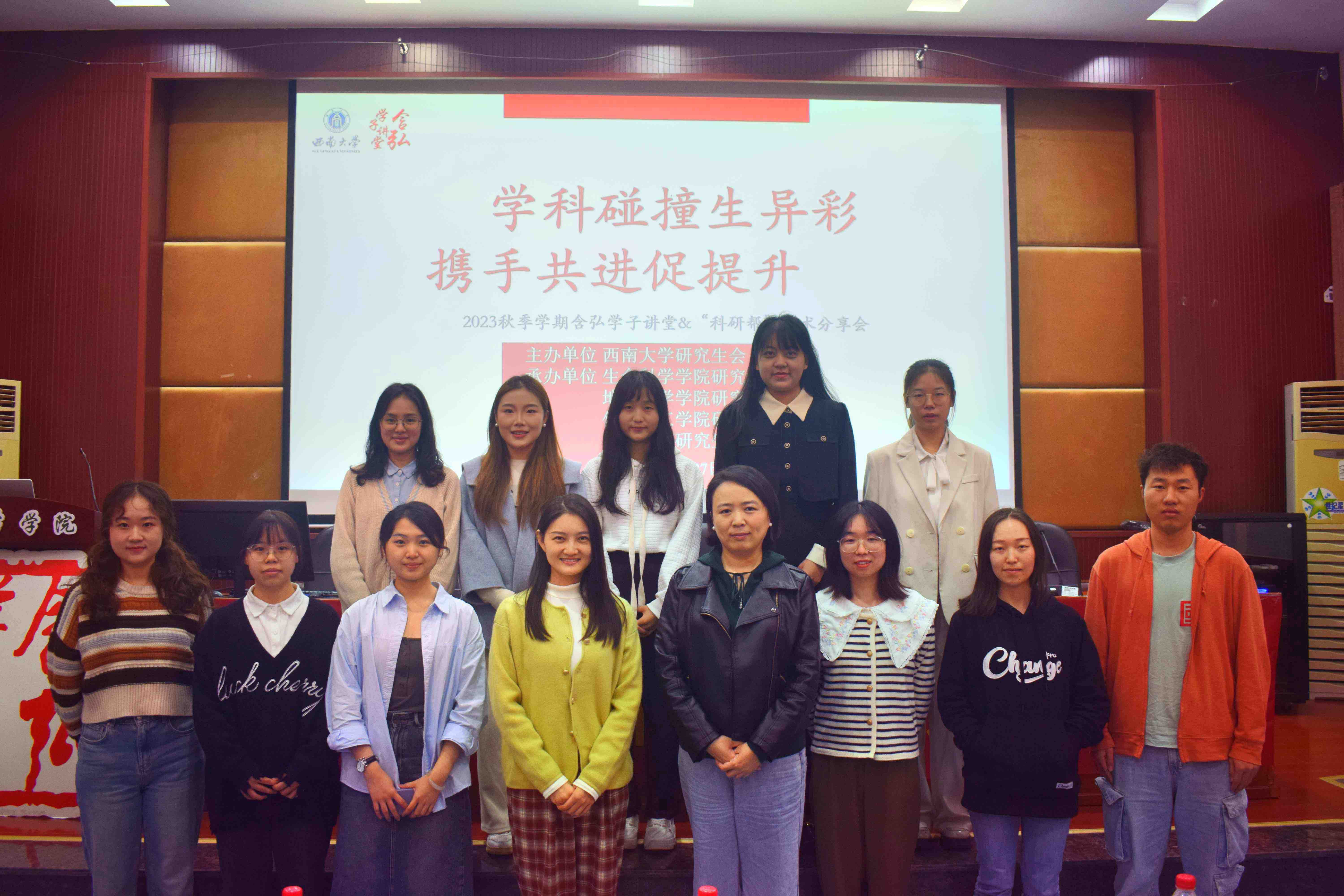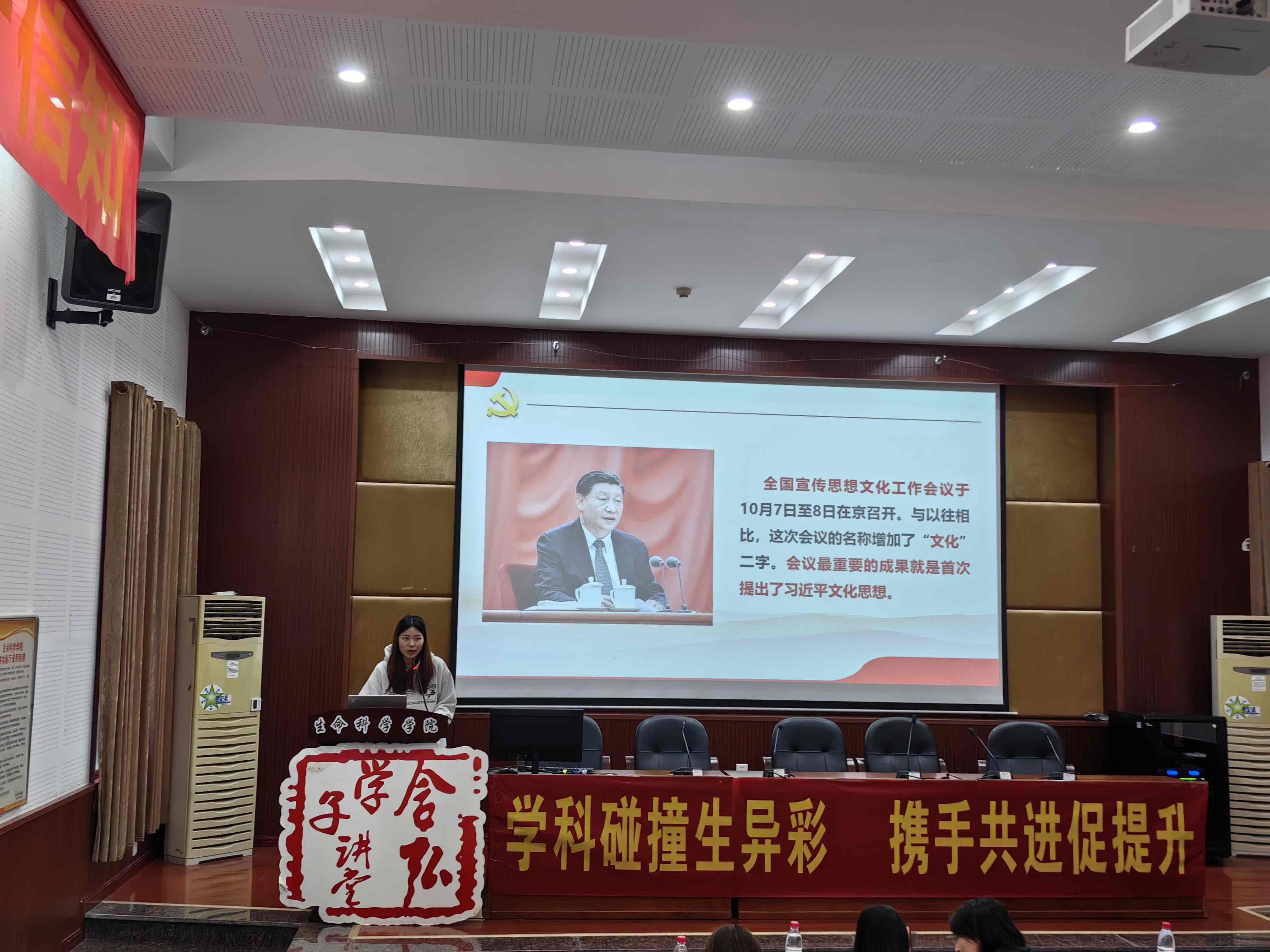 2023年10月27日下午,由PA视讯研究生会主办,生命科学学院研究生会、地理科学研究生会、化学化工学院研究生以及心理学部研究生会联合承办的含弘学子讲堂之“学科碰撞生异彩,携手共进促提升”专题交流会于生命科学学院224多功能厅举行。本次活动邀请生命科学学院党委副书记石莹华老师和生命科学学院研究生辅导员谷彩霞老师出席,由来自生命科学学院2022级植物学专业博士研究生苟玉琴同学、地理科学学院2022级第四纪地质学专业硕士研究生李苏同学、化学化工学院2022级分析化学专业硕士研究生温馨同学和心理学部2022级应用心理专业硕士研究生张万双同学担任主讲人。生命科学学院研究生会、化学化工学院研究生会、心理学部研究生会、地理科学研究生会以及各学院2022级、2023级研究生参加了此次论坛。