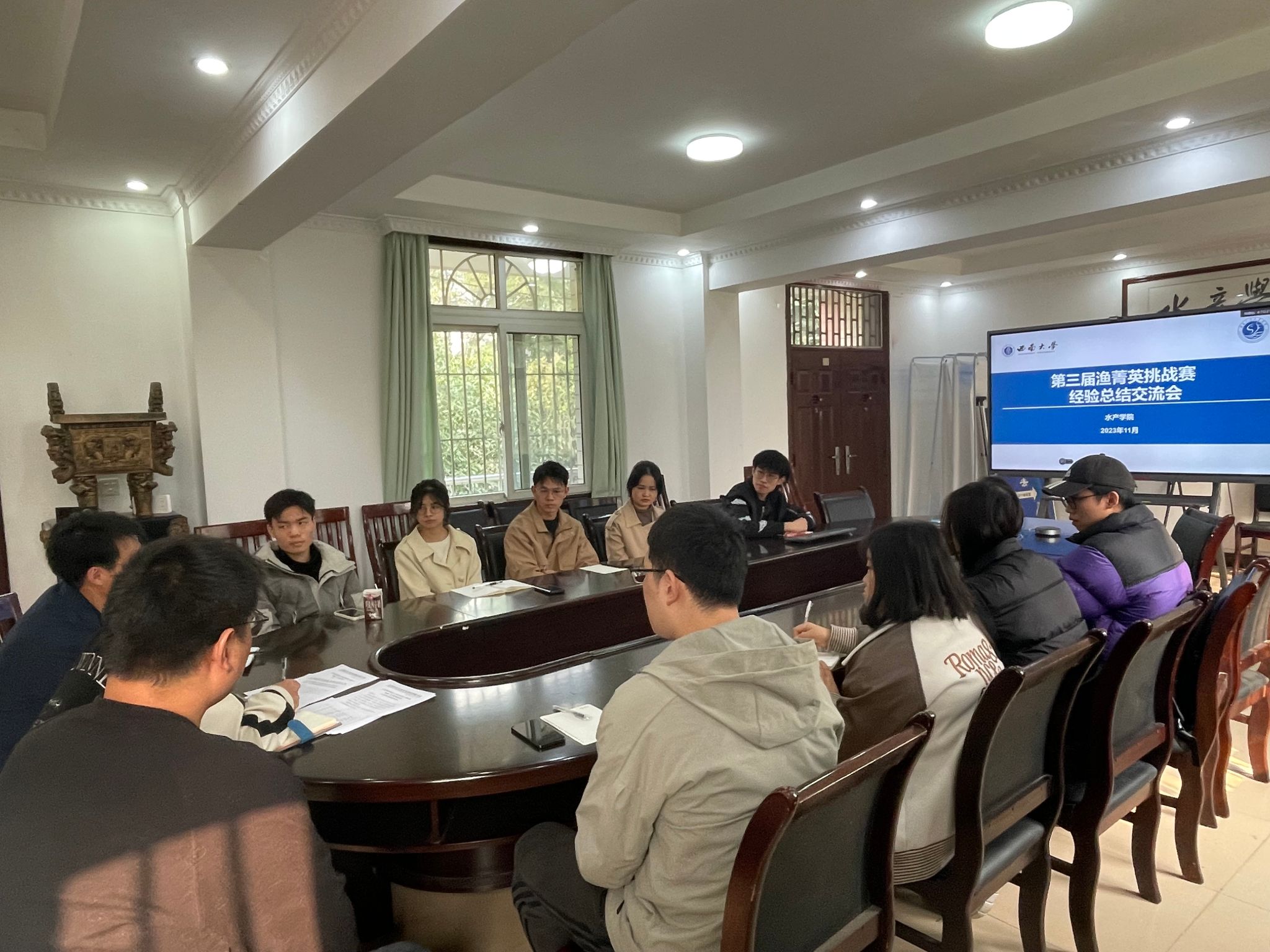 为加强研究生学风建设、砥砺学术志趣,促进朋辈交流和激励,全面、细致总结渔菁英挑战赛工作经验,持续、深入推进以赛促学风,11月24日下午,学院于北碚校区二楼会议室召开第三届渔菁英挑战赛经验总结分析交流会,第二届渔菁英挑战赛队员杜春莹、第三届渔菁英挑战赛全体队员,指导老师吴荣华、朱松参加,会议由辅导员尹斌主持。