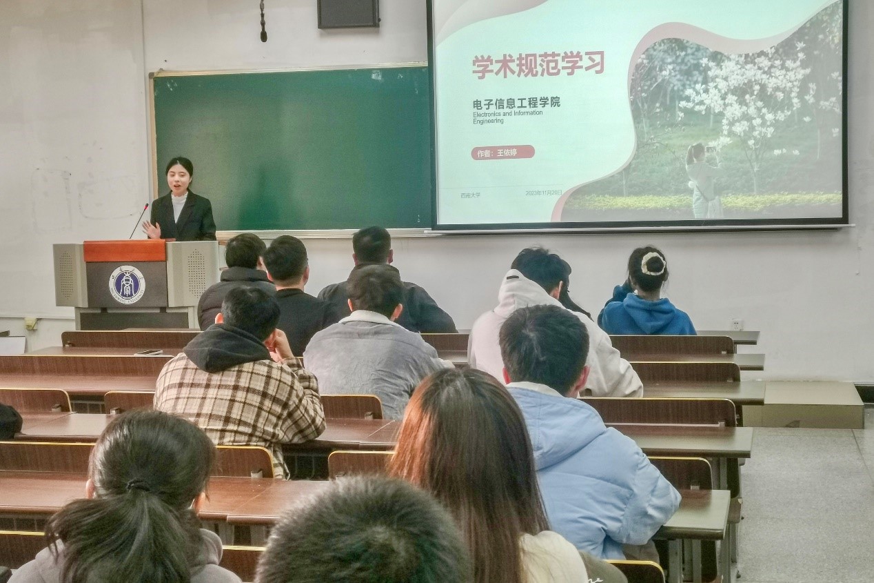 为深入贯彻习近平新时代中国特色社会主义思想,全面落实党的二十大精神、全国研究生教育会议等精神,引导全校师生增强恪守科研诚信和科技伦理规范的思想自觉,切实加强研究生的科研作风和学风建设,提高人才培养质量。电子信息工程学院于2023年11月20日下午举办了研究生科学道德和学风建设月系列活动之—学风建设大讨论。学院研究生辅导员闫宏政以及2022级和2023级全体研究生参加了此次活动,活动由王成卉主持。