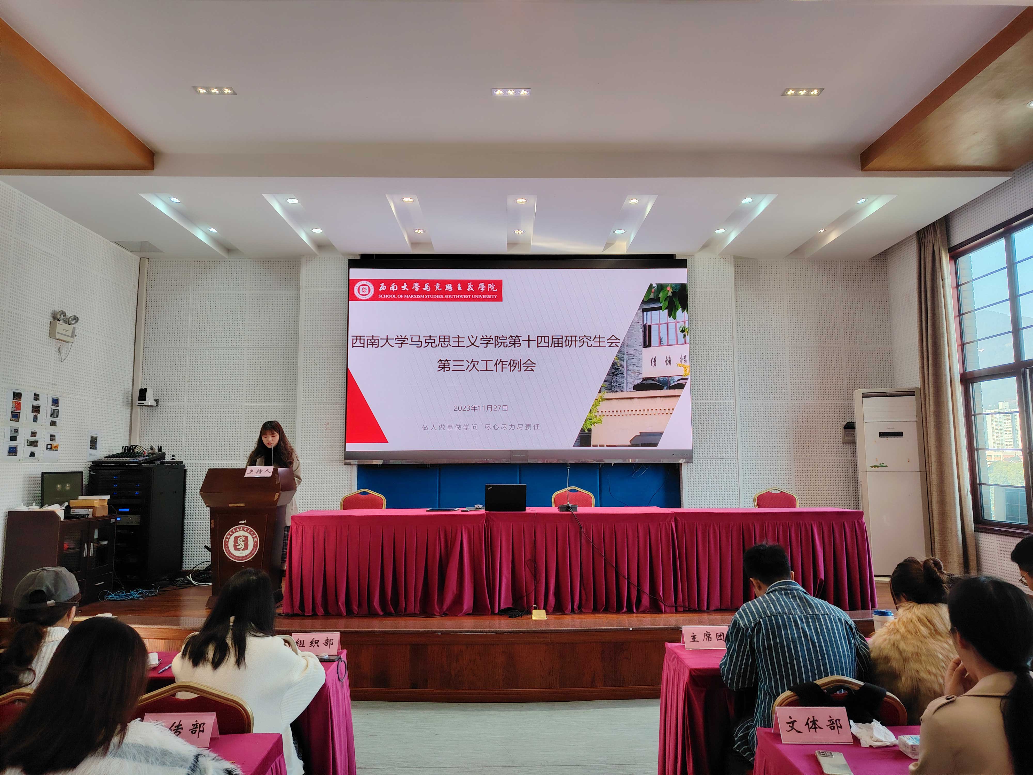 为推动我院研究生会工作顺利开展,提升全体成员理论素养,同时为总结研究生会工作情况,明确下一步工作规划,加强各部门之间的沟通与交流,2023年11月27日,PA视讯马克思主义学院第十四届研究生会理论学习暨第三次工作例会于马克思主义学院501报告厅顺利召开。马克思主义学院研究生辅导员黄林、第十四届研究生会全体成员参加。此次会议由第十四届研究生会综合办工作人员谭亚婷主持。