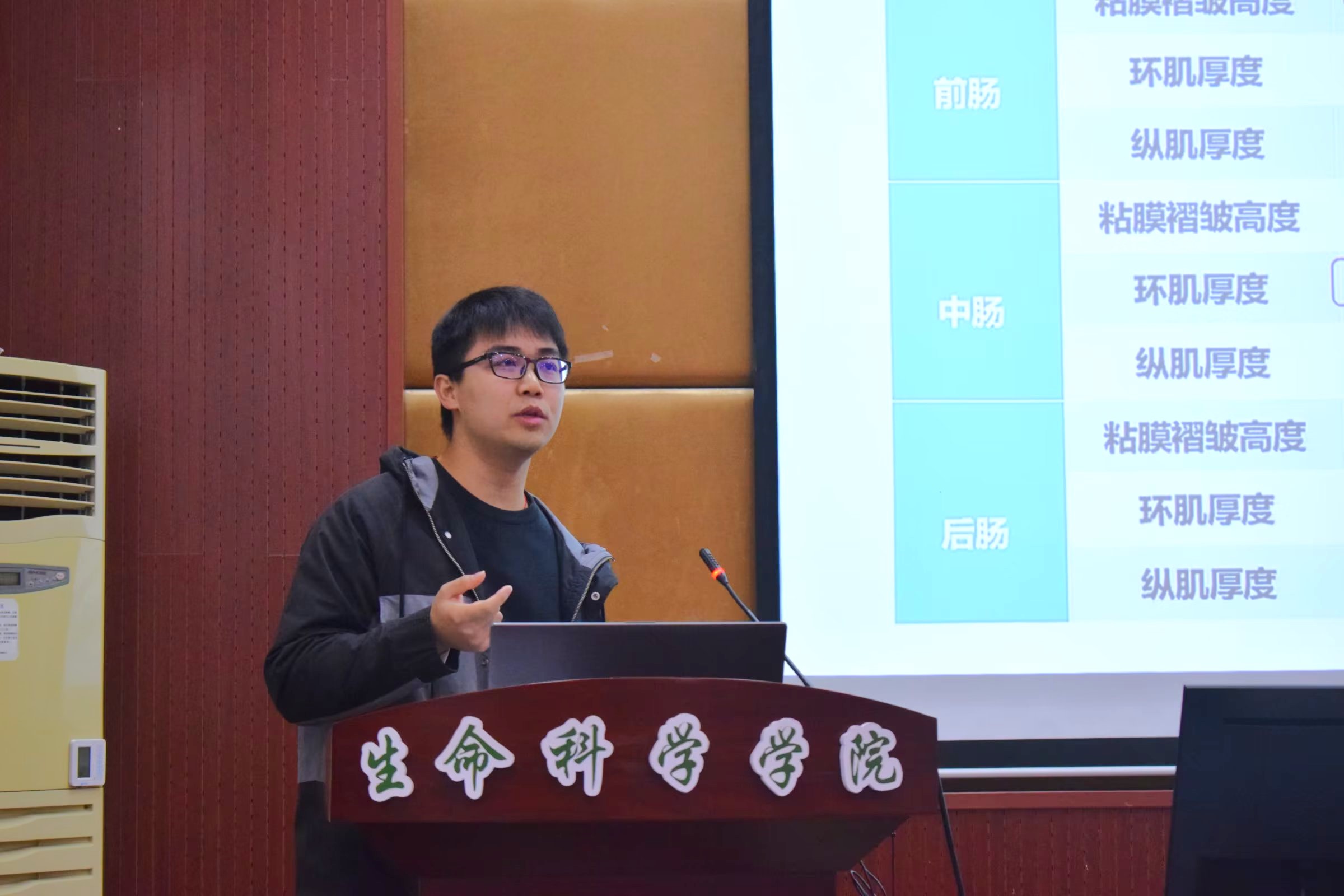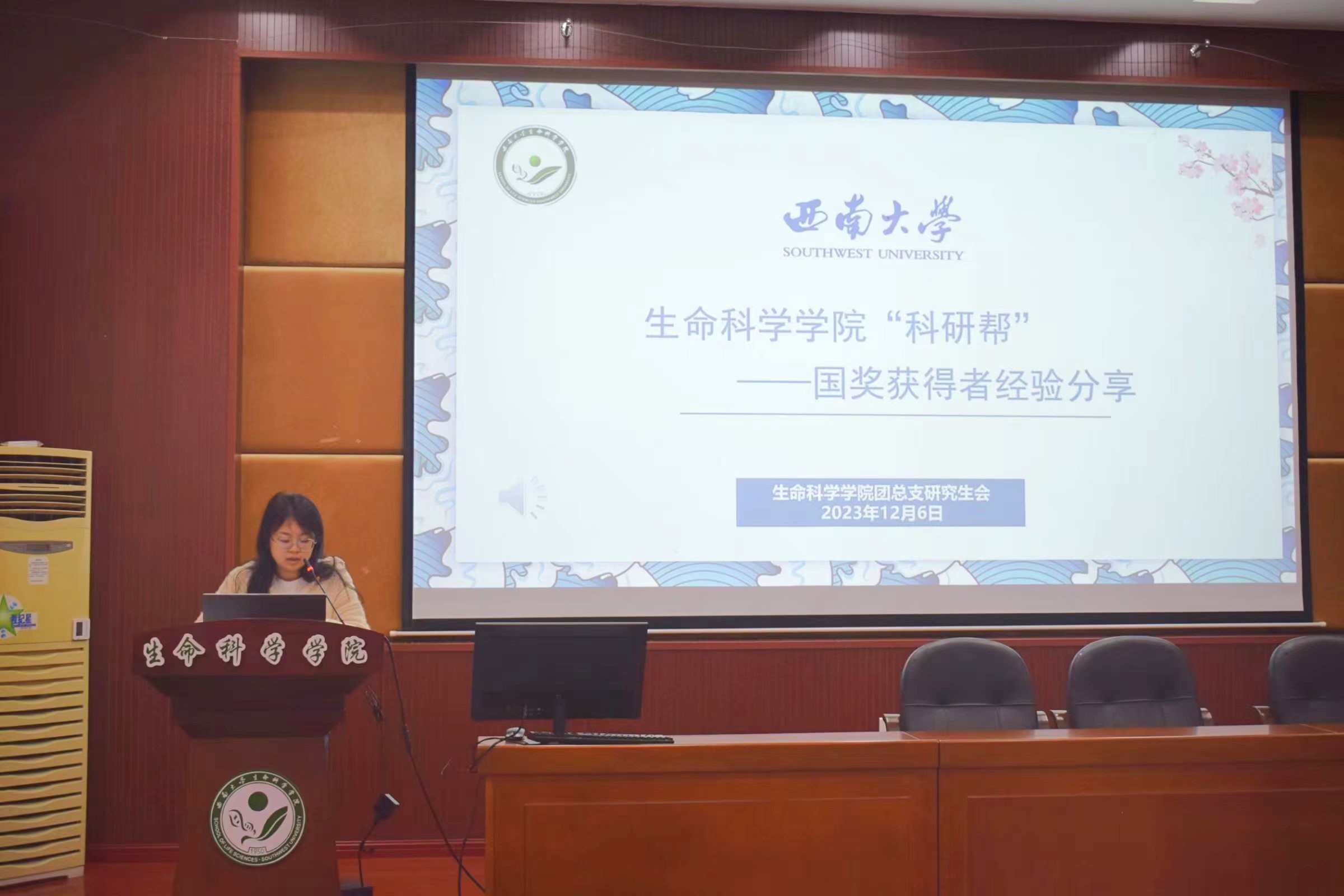 青春风采,榜样力量。为深入学习贯彻党的二十大精神,发挥青年奋进者的榜样引领作用,激发青年一代奋进动力,培养有理想、敢担当、能吃苦、肯奋斗的新时代好青年。2023年12月6日生命科学学院“科研帮”——国奖获得者经验分享会于14教224多功能厅顺利举行,本次活动邀请到了两位2023年国家奖学金获得者,他们分别是2021级生物化学与分子生物学专业硕士熊梦源与2021级动物学专业硕士汪浩宇。两位国奖获得者各自从学术研究、实践经验和个人成长等方面与同学们进行了深入的分享与交流。生命科学学院2023级研究生参加了此次分享活动。