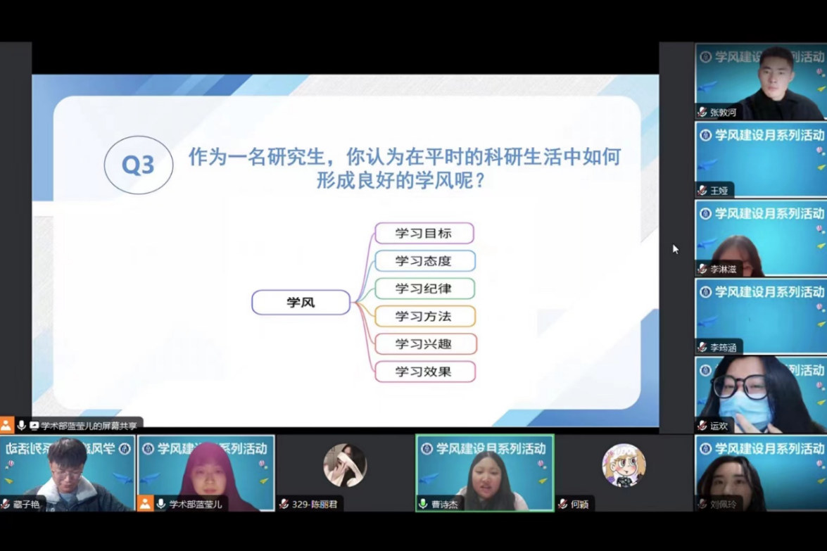 为深入贯彻习近平新时代中国特色社会主义思想,全面落实党的二十大、全国教育大会等相关会议精神,引导全院研究生增强恪守科研诚信,切实加强科研作风和学风建设,食品科学学院研究生会开展了“慎思树学风,笃行造良才”之学术学风大学习大讨论活动,本次活动在12月23日19∶00于线上顺利举行,活动由院研会学术部干事蓝莹儿主持,2023级全体研究生参与本次会议。