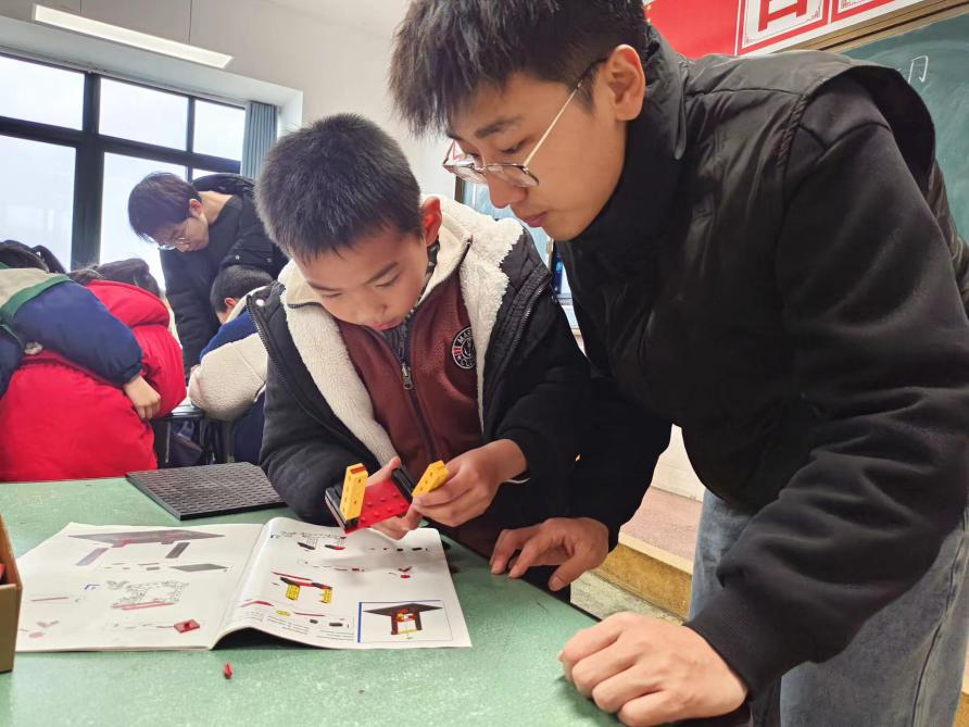 图8:队员张文州与小朋友们拼装积木