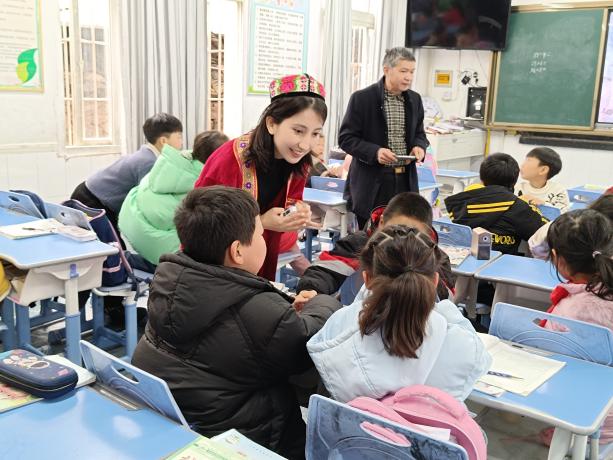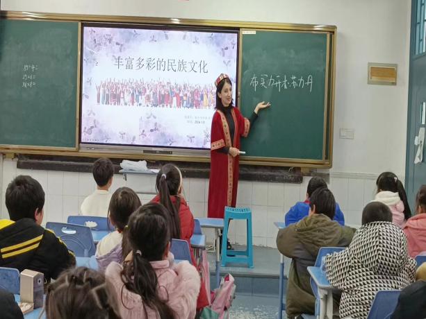 实践队成员布买力开木·苏力丹来自新疆,她身着维吾尔族服饰给孩子们带来了一堂丰富多彩的少数民族文化课。课程通过介绍少数民族文化和讲述阿尼帕妈妈共抚养4个民族19个孩子的故事,让孩子们懂得了在中华民族大家庭中,各民族要像石榴籽那样紧紧抱在一起,民族团结进步之花才能长盛不衰。
