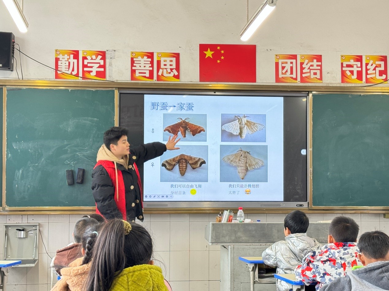 紧接着,实践成员樊庭转入了富有趣味性的生物知识讲堂。本次课程的主题是与中国传统文化紧密相连的“蚕”,他通过生动的图片、有趣的讲解方式向孩子们介绍了相关知识。这不仅拓宽了孩子们的生物知识面,还使他们更好地理解了中国传统的丝绸文化。