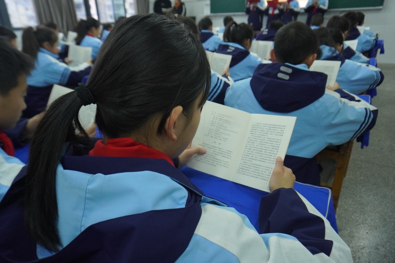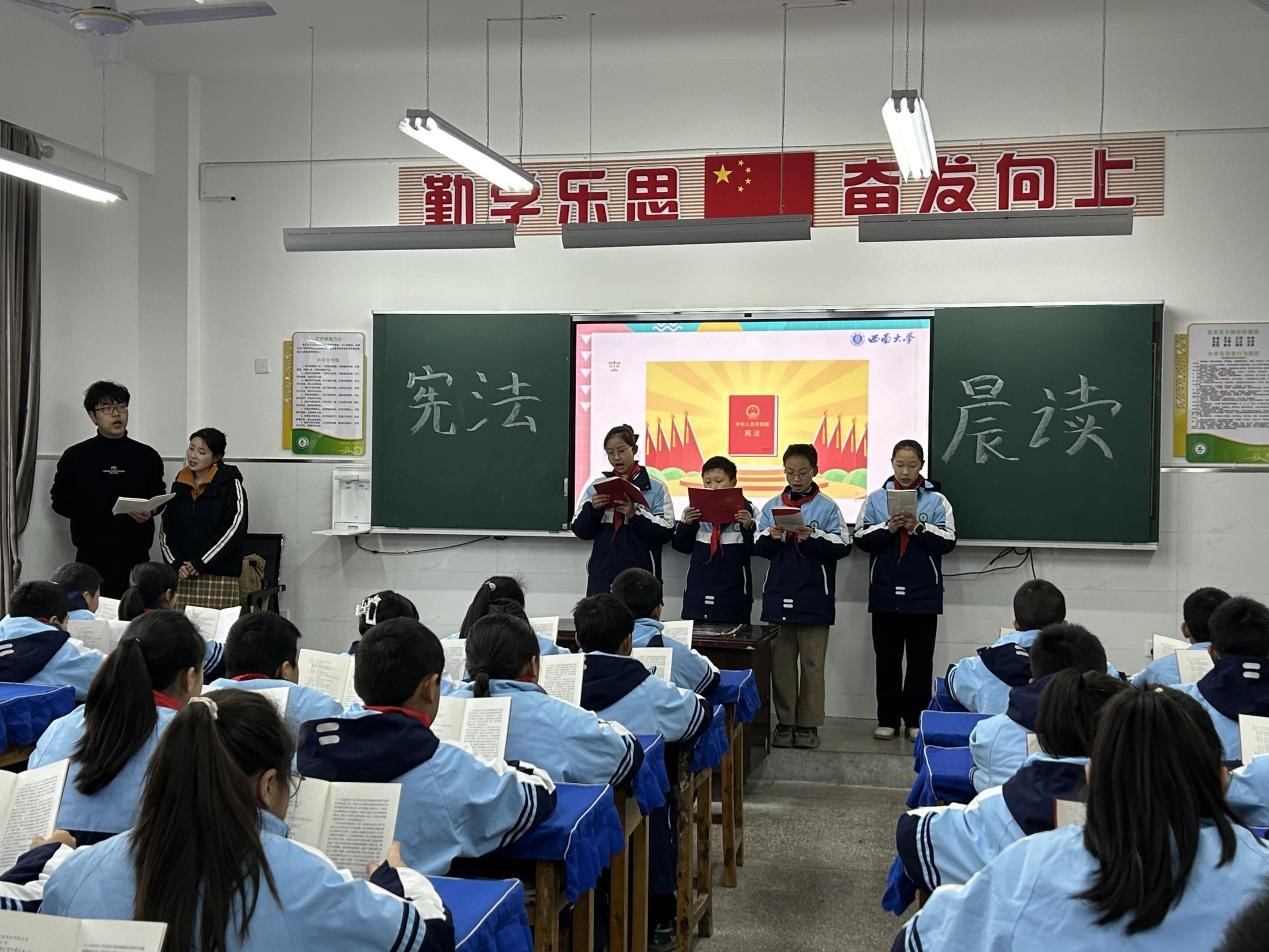 2月28日8时,实践队员唐万钰通过视频教学与生动讲解,增强学生对宪法的了解,提高同学们的法治意识和参与法治建设的责任感。随后,在徐雪梅的引领下,由4名学生领读,全体学生共同朗读宪法序言全文。学生们都被宪法的庄严与崇高所感染,领略了宪法作为国家根本大法的重要性。最后,活动在《宪法伴我们成长》的歌声中结束。