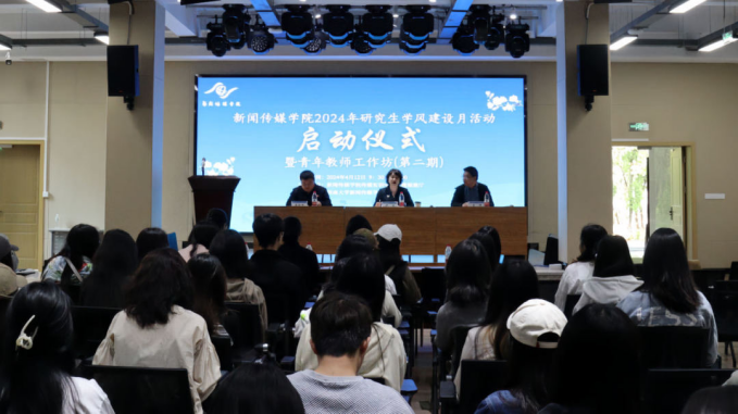 为深入学习贯彻习近平新时代中国特色社会主义思想,全面落实党的二十大精神、全国研究生教育会议精神,促进学院学风建设与青年教师成长的双向赋能,4月12日上午,新闻传媒学院2024年研究生学风建设月活动启动仪式暨青年教师工作坊(第二期)活动正式拉开序幕。学院党委书记严怡、院长龙伟、副院长秦红雨出席活动,研究生导师代表、青年教师代表范雨竹、顾恩澍、林丽,研究生辅导员易安琪,以及2022级、2023级全体硕博研究生参会。严怡书记主持启动仪式。