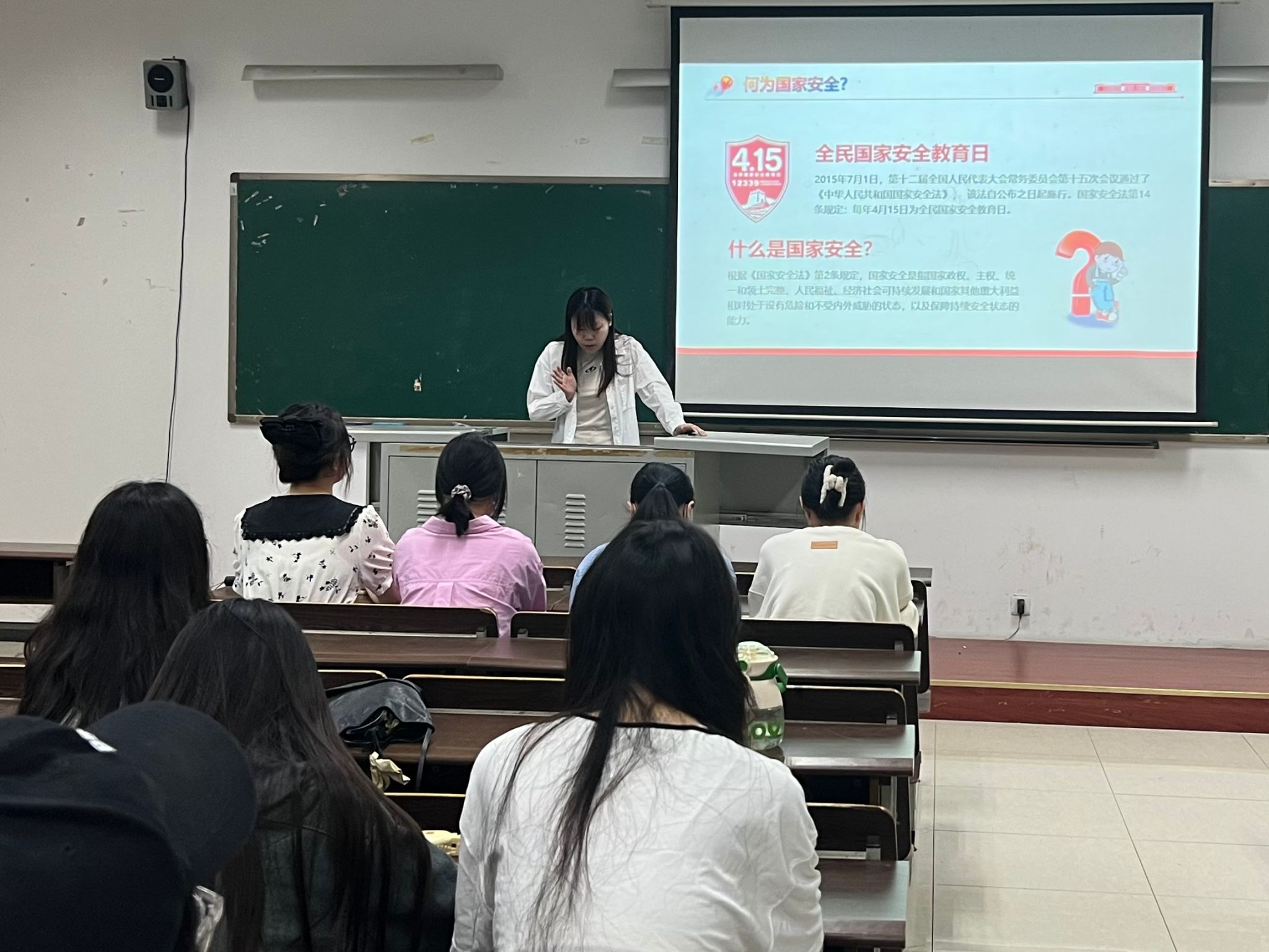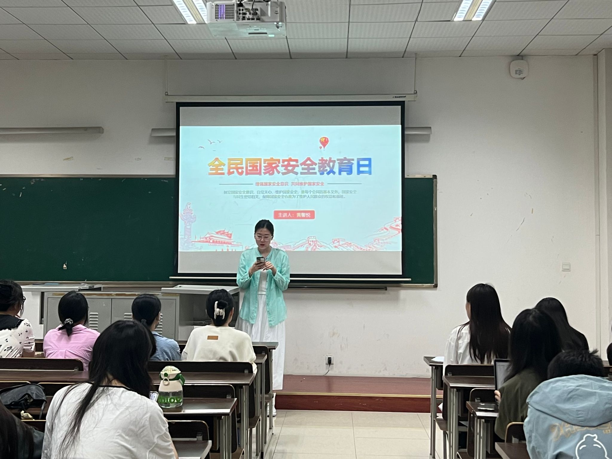 黄馨悦首先对国家安全的内涵及意义、当前国际国内形势、当代青年如何保卫国家安全等五个方面的知识进行了深入且全面的讲解,她将理论与实际相结合,帮助大家了提升国家安全意识和素养。国家安全是指国家政权、主权、统一和领土完整、人民福祉、经济社会可持续发展和国家其他重大利益相对处于没有危险和不受内外威胁的状态,以及保障持续安全状态的能力。认识到国家安全不仅仅是国防安全和间谍渗透等问题,还与我们每个人息息相关。在接下来的问答环节中,同学们积极回答了相关国家安全知识,在巩固所学内容的同时再一次增强了国家安全意识、树立了底线思维。