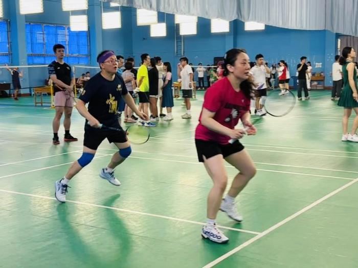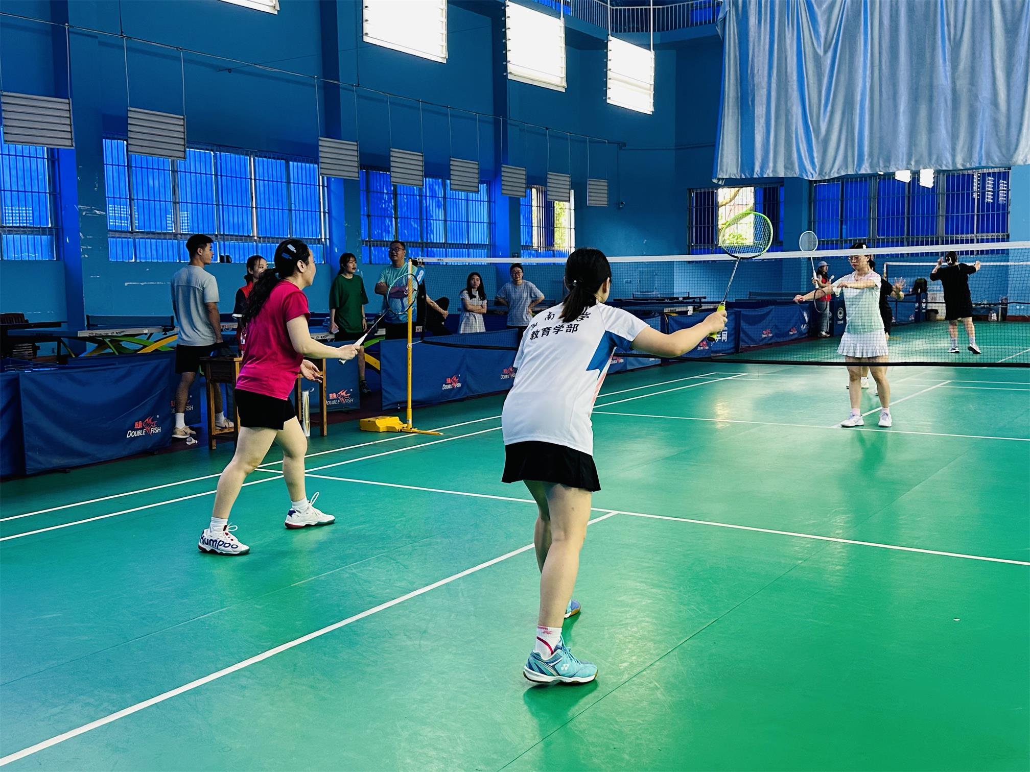 本次比赛共设立男子双打、女子双打、男女混合双打三项项目。教育学部男子双打出战的是杨岗老师和高泉涌同学,他们凭借过硬的实力和出色的预判一次次化险为夷,运用巧妙的战术策略攻破对手防线。