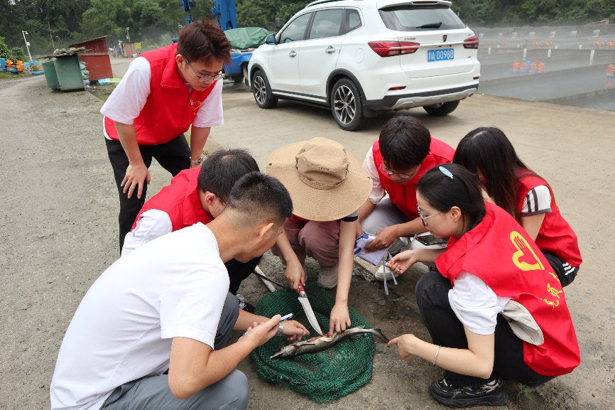 澄澈的水不断涌入鱼塘内,激起阵阵波纹,连片排列的鱼池被青山环绕,大小不一的鲟鱼在池塘里肆意畅游。队员们穿上养殖下水裤,深入了解鲟鱼生活环境,体验刷池塘、喂饲料、解剖观察病鱼……