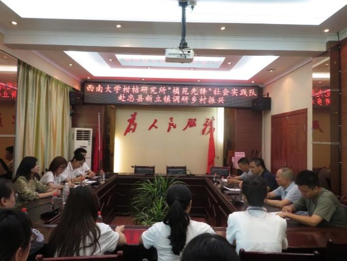 待了实践队一行人。沈亚林详细介绍了新立镇在乡村治理现代化方面的成果,特别是“数字重庆”一体化智治平台的运用,田园综合体旅游景区、全国卫生镇等荣誉的获得以及三峡橘乡田园马拉松、桃李赏花节和“忠橙”开园出口等特色活动。